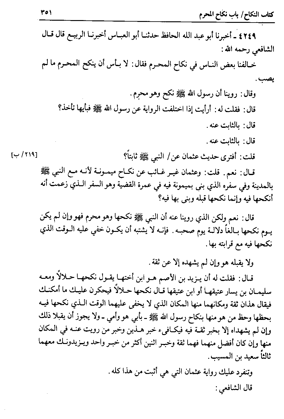 قلت : أفترى حديث عثمان عن النبي صلى الله عليه وسلم ثابتاً ؟ قال : نعم . قلت : وعثمان غير غائب عن نكاح ميمونة لأنه مع النبي صلى الله عليه وسلم بالمدينة وفي سفره الذي بنى بميمونة فيه في عمرة القضية وهو السفر الذي زعمت أنه أنكحها فيه وإنما نكحها قبله وبنى بها فيه ؟ قال : نعم ولكن الذي روينا عنه أن النبي صلى الله عليه وسلم نكحها وهو محرم فهو وإن لم يكن يوم نكحها بالغاً دلالة يوم صحبه . فإنه لا يشتبه أن يكون خفي عليه الوقت الذي نكحها فيه مع قرابته بها.