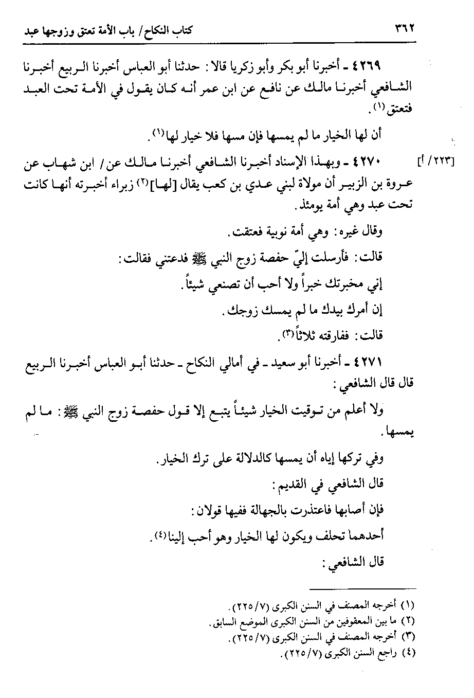 4270 - وبهذا الإسناد أخبرنا الشافعي أخبرنا مالك عن ابن شهاب عن عروة بن الزبير أن مولاة لبني عدي بن كعب يقال لها زبراء أخبرته أنها كانت تحت عبد وهي أمة يومئذ.