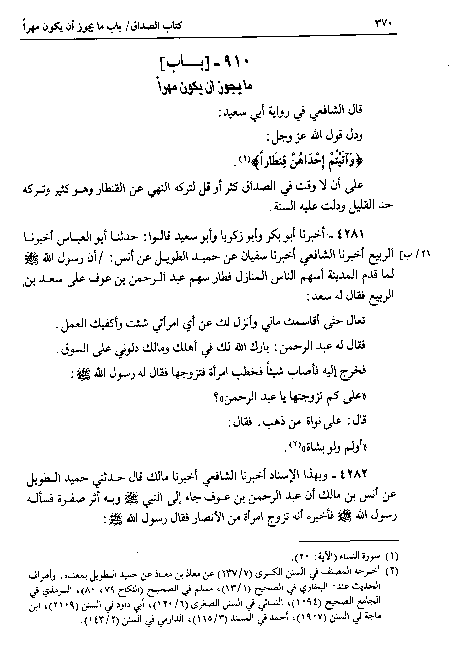 4282 - وبهذا الإسناد أخبرنا الشافعي أخبرنا مالك قال حدثني حميد الطويل عن أنس بن مالك أن عبد الرحمن بن عوف جاء إلى النبي صلى الله عليه وسلم وبه أثر صفرة فسأله رسول الله صلى الله عليه وسلم فأخبره أنه تزوج امرأة من الأنصار فقال رسول الله صلى الله عليه وسلم