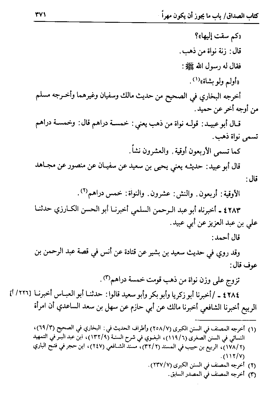 قال أحمد وقد روي في حديث سعيد بن بشير عن قتادة عن أنس في قصة عبد الرحمن بن عوف قال تزوج على وزن نواة من ذهب قومت خمسة دراهم.