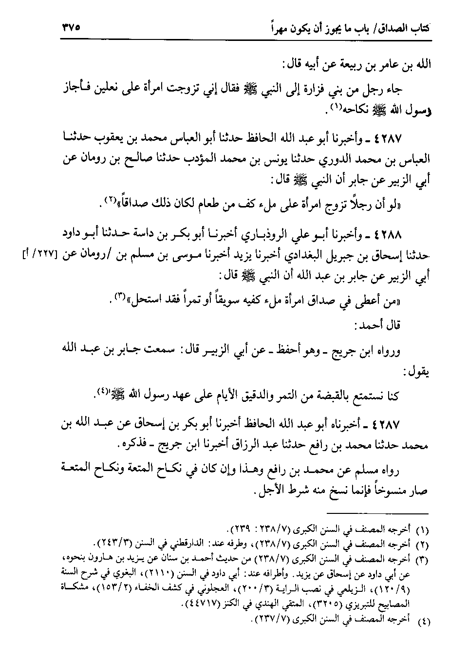 4287 - وأخبرنا أبو عبد الله الحافظ حدثنا أبو العباس محمد بن يعقوب حدثنا العباس بن محمد الدوري حدثنا يونس بن محمد المؤدب حدثنا صالح بن رومان عن أبي الزبير عن جابر أن النبي صلى الله عليه وسلم قال لو أن رجلاً تزوج امرأة على ملء كف من طعام لكان ذلك صداقاً.