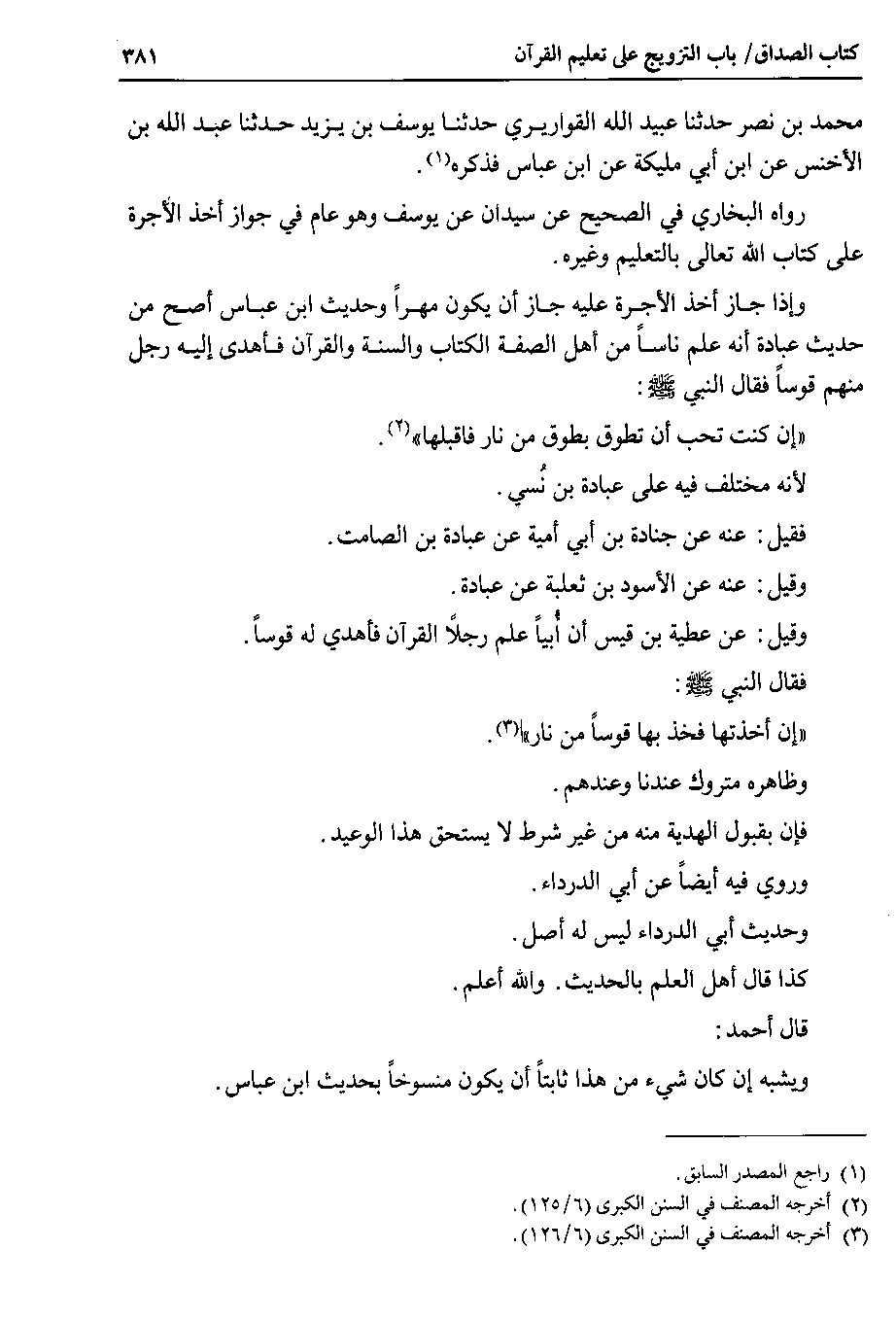 وإذا جاز أخذ الأجرة عليه جاز أن يكون مهراً وحديث ابن عباس أصح من حديث عبادة أنه علم ناساً من أهل الصفة الكتاب والسنة والقرآن فأهدى إليه رجل منهم قوساً فقال النبي صلى الله عليه وسلم إن كنت تحب أن تطوق بطوق من نار فاقبلها.