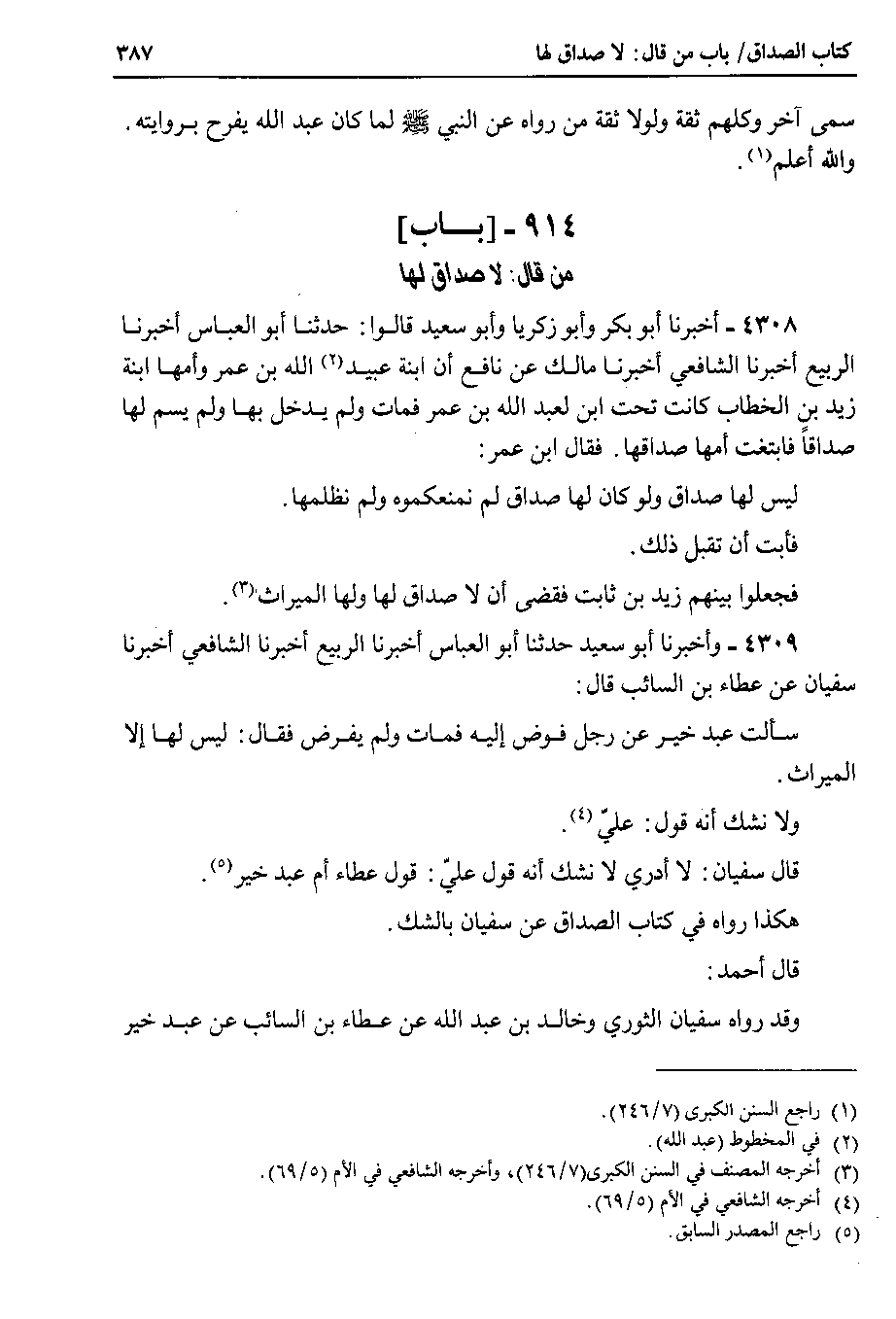 4308 - أخبرنا أبو بكر وأبو زكريا وأبو سعيد قالوا : حدثنا أبو العباس أخبرنا الربيع أخبرنا الشافعي أخبرنا مالك عن نافع أن ابنة عبيد الله بن عمر وأمها ابنة زيد بن الخطاب كانت تحت ابن لعبد الله بن عمر فمات ولم يدخل بها ولم يسم لها صداقاً فابتغت أمها صداقها . فقال ابن عمر ليس لها صداق ولو كان لها صداق لم نمنعكموه ولم نظلمها.
