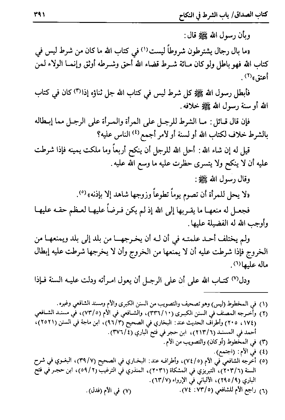 فإن قال قائل : ما الشرط للرجل على المرأة والمرأة على الرجل مما إبطاله بالشرط خلاف لكتاب الله أو لسنة أو لأمر أجمع الناس عليه ؟ قيل له إن شاء الله : أحل الله للرجل أن ينكح أربعاً وما ملكت يمينه فإذا شرطت عليه أن لا ينكح ولا يتسرى حظرت عليه ما وسع الله عليه.