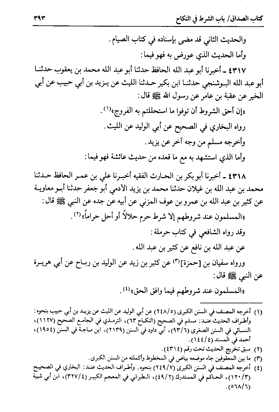 وأما الذي استشهد به مع ما قعده من حديث عائشة فهو فيما 4318 - أخبرنا أبو بكر بن الحارث الفقيه أخبرنا علي بن عمر الحافظ حدثنا محمد بن عبد الله بن غيلان حدثنا محمد بن يزيد الآدمي أبو جعفر حدثنا أبو معاوية عن كثير بن عبد الله بن عمرو بن عوف المزني عن أبيه عن جده عن النبي صلى الله عليه وسلم قال المسلمون عند شروطهم إلا شرط حرم حلالاً أو أحل حراماً.