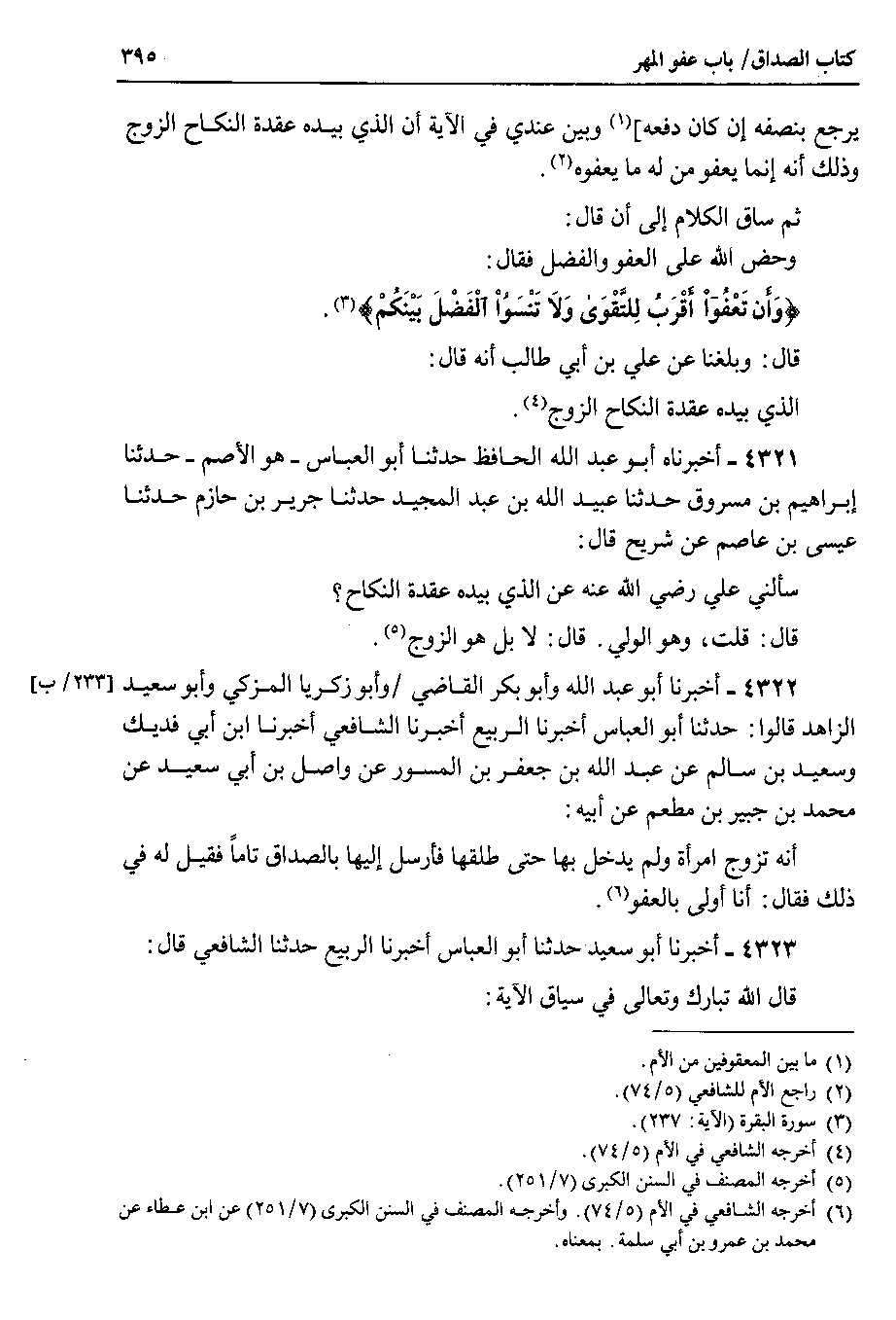 4322 - أخبرنا أبو عبد الله وأبو بكر القاضي وأبو زكريا المزكي وأبو سعيد الزاهد قالوا : حدثنا أبو العباس أخبرنا الربيع أخبرنا الشافعي أخبرنا ابن أبي فديك وسعيد بن سالم عن عبد الله بن جعفر بن المسور عن واصل بن أبي سعيد عن محمد بن جبير بن مطعم عن أبيه أنه تزوج امرأة ولم يدخل بها حتى طلقها فأرسل إليها بالصداق تاماً فقيل له في ذلك فقال : أنا أولى بالعفو.
