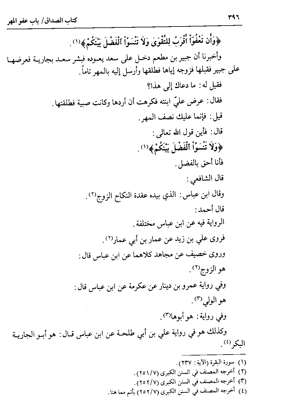 {وأن تعفوا أقرب للتقوى ولا تنسوا الفضل بينكم} وأخبرنا أن جبير بن مطعم دخل على سعد يعوده فبشر سعد بجارية فعرضها على جبير فقبلها فزوجه إياها فطلقها وأرسل إليه بالمهر تاماً.