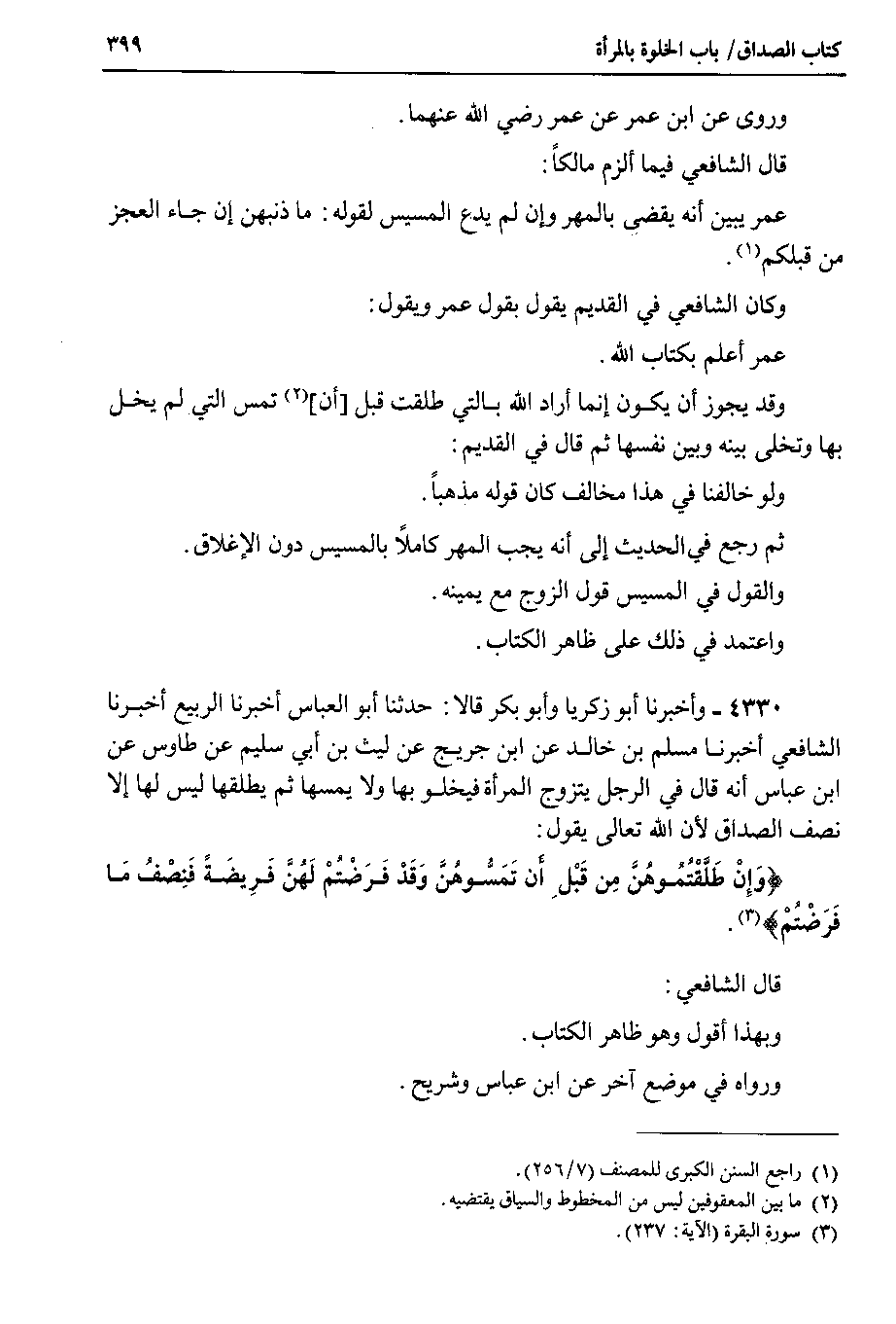 4330 - وأخبرنا أبو زكريا وأبو بكر قالا : حدثنا أبو العباس أخبرنا الربيع أخبرنا الشافعي أخبرنا مسلم بن خالد عن ابن جريج عن ليث بن أبي سليم عن طاووس عن ابن عباس أنه قال في الرجل يتزوج المرأة فيخلو بها ولا يمسها ثم يطلقها ليس لها إلا نصف الصداق لأن الله تعالى يقول {وإن طلقتموهن من قبل أن تمسوهن وقد فرضتم لهن فريضة فنصف ما فرضتم} قال الشافعي وبهذا أقول وهو ظاهر الكتاب.