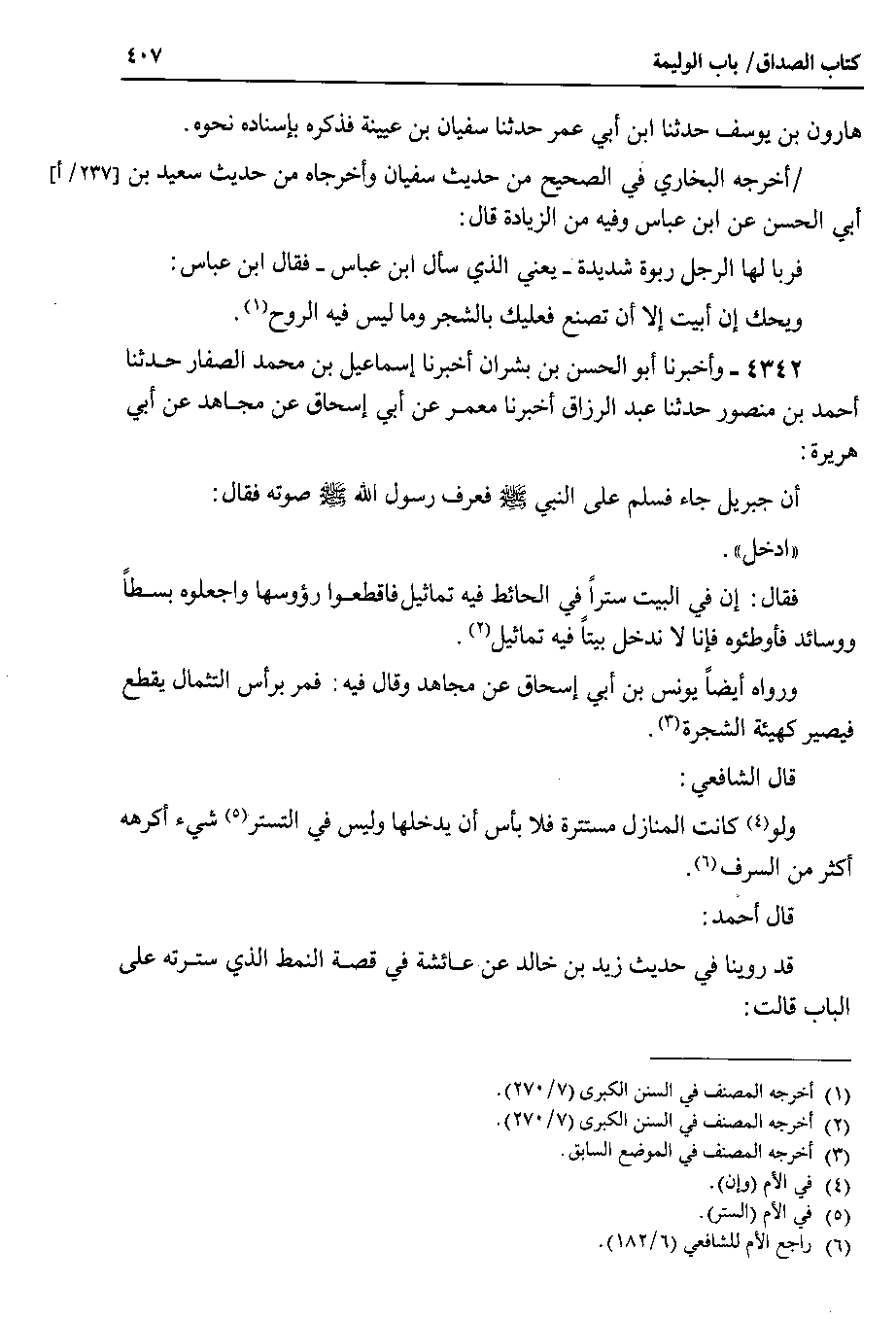 فقال : إن في البيت ستراً في الحائط فيه تماثيل فاقطعوا رؤوسها واجعلوه بسطاً ووسائد فأوطئوه فإنا لا ندخل بيتاً فيه تماثيل.