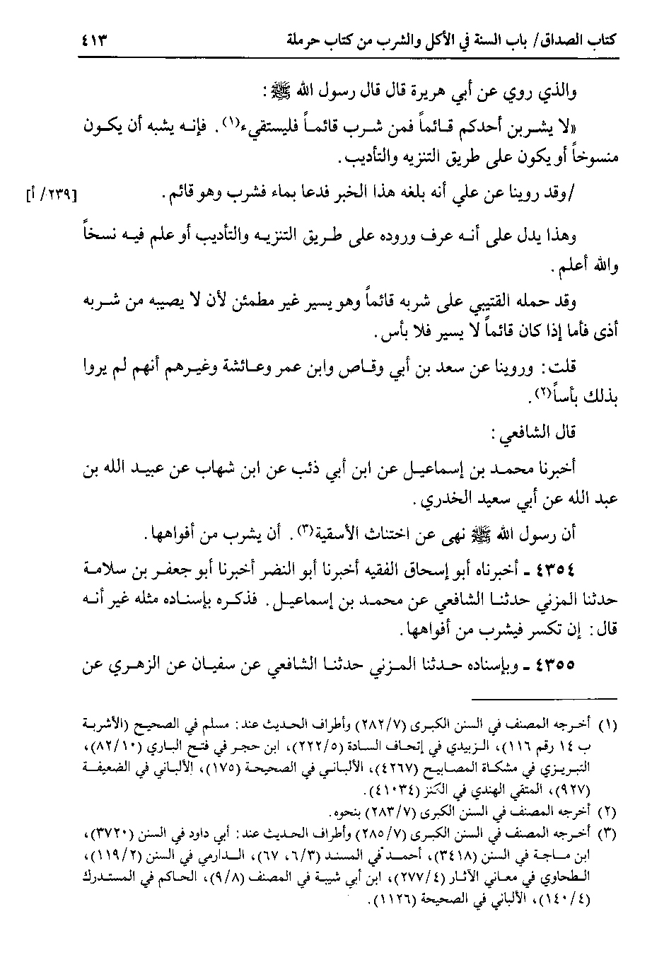 3 @والذي روي عن أبي هريرة قال قال رسول الله صلى الله عليه وسلم لا يشربن أحدكم قائماً فمن شرب قائماً فليستقيء فإنه يشبه أن يكون منسوخاً أو يكون على طريق التنزيه والتأديب.