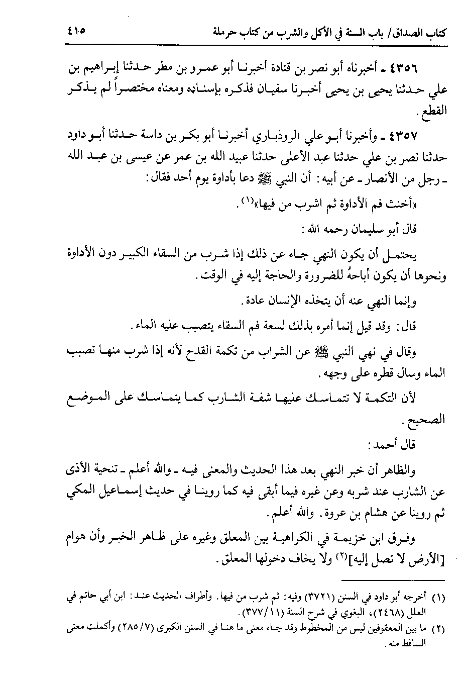 4357 - وأخبرنا أبو علي الروذباري أخبرنا أبو بكر بن داسة حدثنا أبو داود حدثنا نصر بن علي حدثنا عبد الأعلى حدثنا عبيد الله بن عمر عن عيسى بن عبد الله - رجل من الأنصار - عن أبيه : أن النبي صلى الله عليه وسلم دعا بأداوة يوم أحد فقال أخنث فم الأداوة ثم اشرب من فيها.