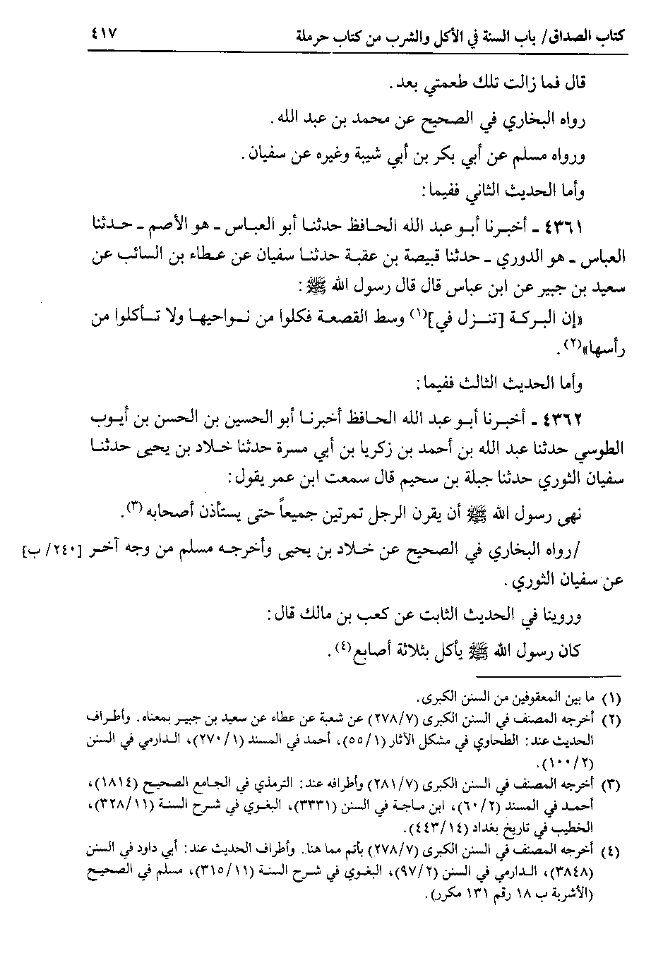 وأما الحديث الثاني ففيما 4361 - أخبرنا أبو عبد الله الحافظ حدثنا أبو العباس - هو الأصم - حدثنا العباس - هو الدوري - حدثنا قبيصة بن عقبة حدثنا سفيان عن عطاء بن السائب عن سعيد بن جبير عن ابن عباس قال قال رسول الله صلى الله عليه وسلم إن البركة تنزل في وسط القصعة فكلوا من نواحيها ولا تأكلوا من رأسها.