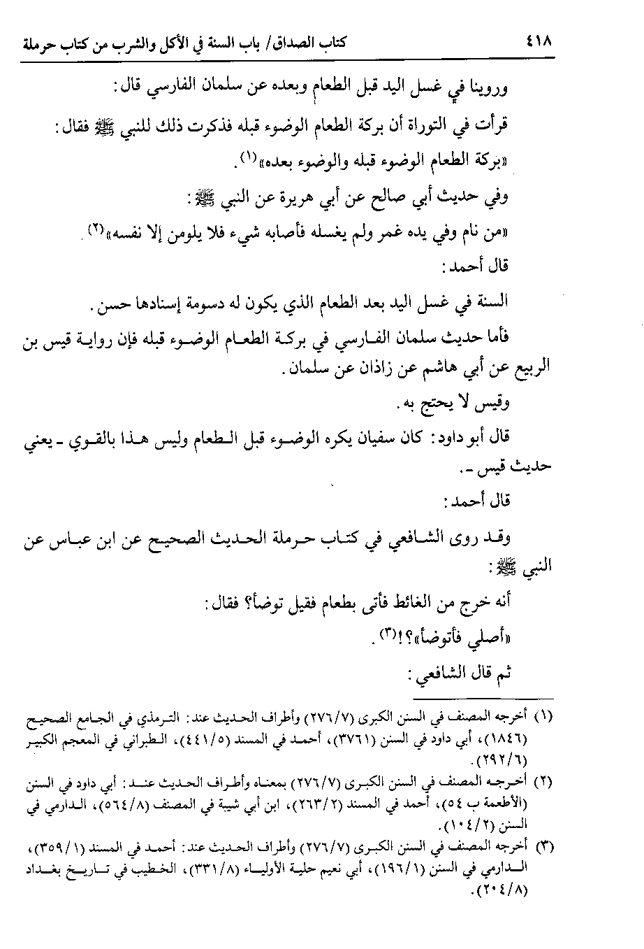 8 @وروينا في غسل اليد قبل الطعام وبعده عن سلمان الفارسي قال قرأت في التوراة أن بركة الطعام الوضوء قبله فذكرت ذلك للنبي صلى الله عليه وسلم فقال بركة الطعام الوضوء قبله والوضوء بعده.