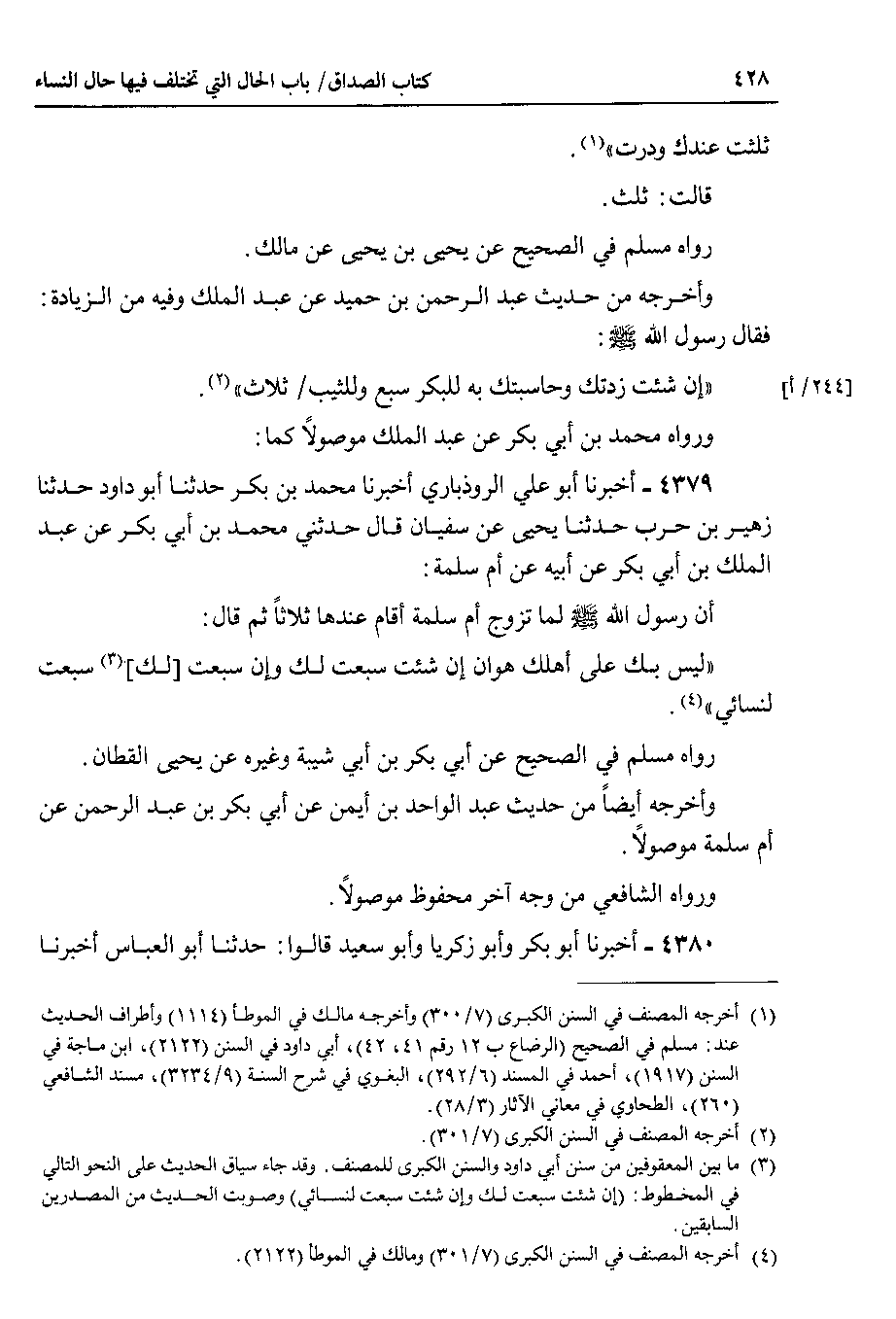 ورواه محمد بن أبي بكر عن عبد الملك موصولاً كما 4379 - أخبرنا أبو علي الروذباري أخبرنا محمد بن بكر حدثنا أبو داود حدثنا زهير بن حرب حدثنا يحيى عن سفيان قال حدثني محمد بن أبي بكر عن عبد الملك بن أبي بكر عن أبيه عن أم سلمة أن رسول الله صلى الله عليه وسلم لما تزوج أم سلمة أقام عندها ثلاثاً ثم قال ليس بك على أهلك هوان إن شئت سبعت لك وإن سبعت لك سبعت لنسائي.