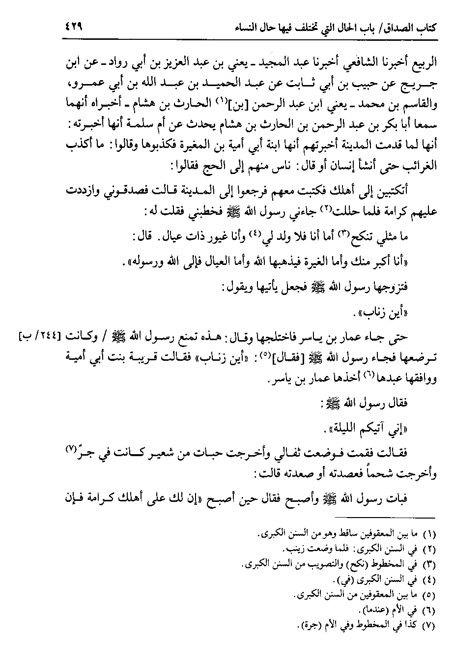 الربيع أخبرنا الشافعي أخبرنا عبد المجيد _ يعني بن عبد العزيز بن أبي رواد _ عن ابن جريج عن حبيب بن أبي ثابت عن عبد الحميد بن عبد الله بن أبي عمرو ، والقاسم بن محمد _ يعني ابن عبد الرحمن بن الحارث بن هشام _ أخبراه أنهما سمعا أبا بكر بن عبد الرحمن بن الحارث بن هشام يحدث عن أم سلمة أنها أخبرته أنها لما قدمت المدينة أخبرتهم أنها ابنة أبي أمية بن المغيرة فكذبوها وقالوا : ما أكذب الغرائب حتى أنشأ إنسان أو قال : ناس منهم إلى الحج فقالوا أتكتبين إلى أهلك فكتبت معهم فرجعوا إلى المدينة قالت فصدقوني وازددت عليهم كرامة فلما حللت جاءني رسول الله صلى الله عليه وسلم فخطبني فقلت له ما مثلي تنكح أما أنا فلا ولد لي وأنا غيور ذات عيال . قال أنا أكبر منك وأما الغيرة فيذهبها الله وأما العيال فإلى الله ورسوله.