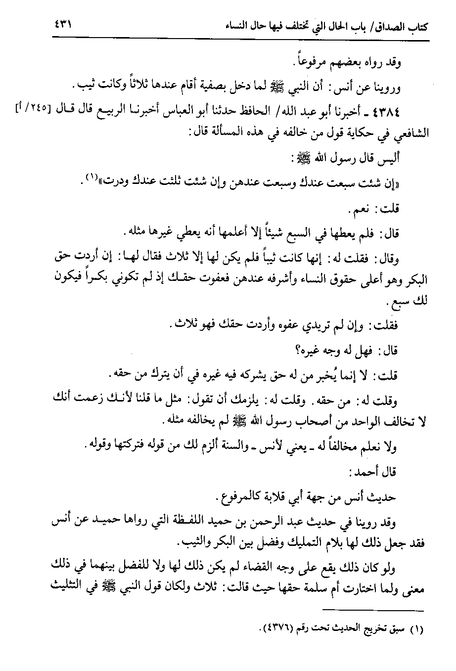 4384 - أخبرنا أبو عبد الله الحافظ حدثنا أبو العباس أخبرنا الربيع قال قال الشافعي في حكاية قول من خالفه في هذه المسألة قال أليس قال رسول الله صلى الله عليه وسلم إن شئت سبعت عندك وسبعت عندهن وإن شئت ثلثت عندك ودرت.