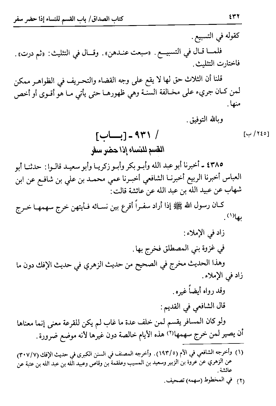 4385 - أخبرنا أبو عبد الله وأبو بكر وأبو زكريا وأبو سعيد قالوا : حدثنا أبو العباس أخبرنا الربيع أخبرنا الشافعي أخبرنا عمي محمد بن علي بن شافع عن ابن شهاب عن عبيد الله بن عبد الله عن عائشة قالت كان رسول الله صلى الله عليه وسلم إذا أراد سفراً أقرع بين نسائه فأيتهن خرج سهمها خرج بها.