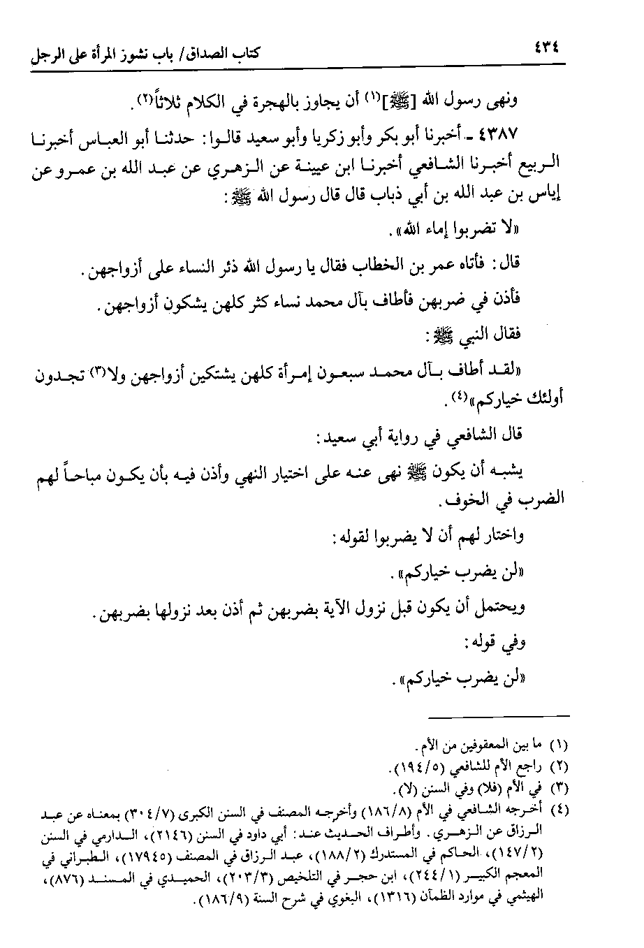 4387 - أخبرنا أبو بكر وأبو زكريا وأبو سعيد قالوا : حدثنا أبو العباس أخبرنا الربيع أخبرنا الشافعي أخبرنا ابن عيينة عن الزهري عن عبد الله بن عمرو عن إياس بن عبد الله بن أبي ذباب قال قال رسول الله صلى الله عليه وسلم لا تضربوا إماء الله.