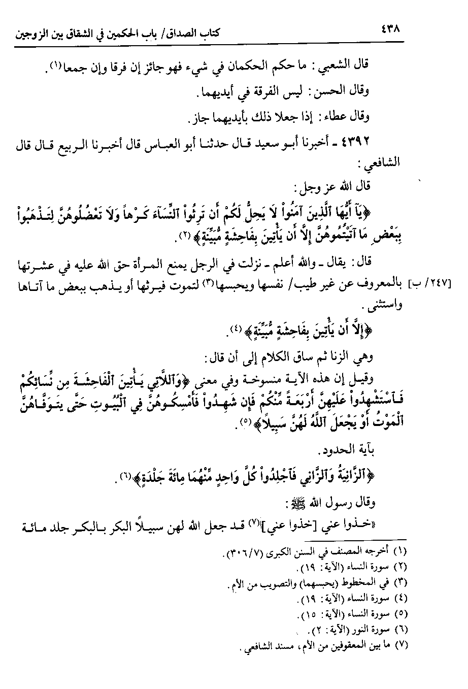 4392 - أخبرنا أبو سعيد قال حدثنا أبو العباس قال أخبرنا الربيع قال قال الشافعي قال الله عز وجل {يا أيها الذين آمنوا لا يحل لكم أن ترثوا النساء كرها ولا تعضلوهن لتذهبوا ببعض ما آتيتموهن إلا أن يأتين بفاحشة مبينة}.