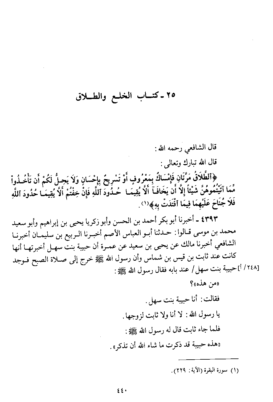 4393 - أخبرنا أبو بكر أحمد بن الحسن وأبو زكريا يحيى بن إبراهيم وأبو سعيد محمد بن موسى قالوا : حدثنا أبو العباس الأصم أخبرنا الربيع بن سليمان أخبرنا الشافعي أخبرنا مالك عن يحيى بن سعيد عن عمرة أن حبيبة بنت سهل أخبرتها أنها كانت عند ثابت بن قيس بن شماس وأن رسول الله صلى الله عليه وسلم خرج إلى صلاة الصبح فوجد حبيبة بنت سهل عند بابه فقال رسول الله صلى الله عليه وسلم من هذه ؟ فقالت : أنا حبيبة بنت سهل.