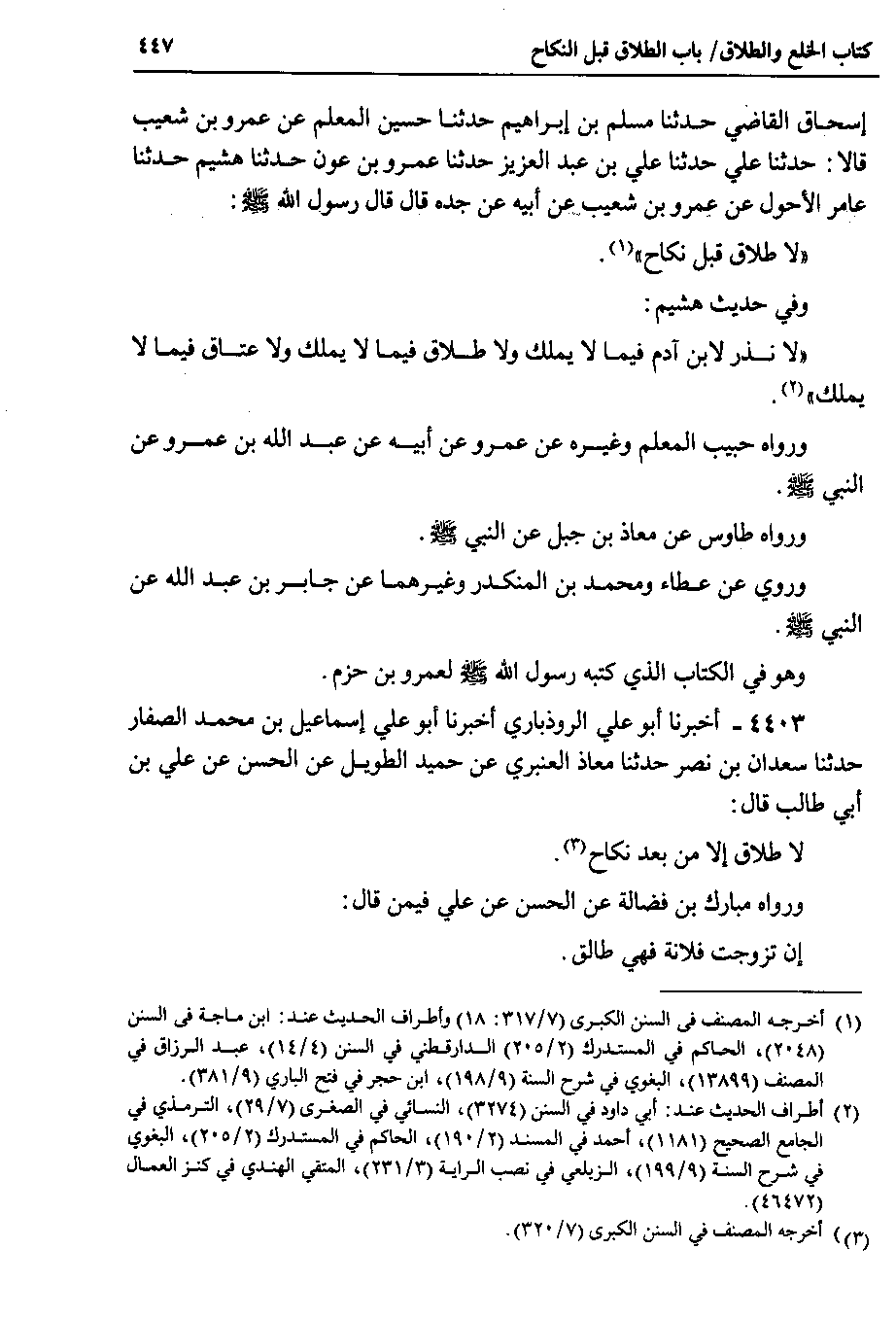 4403 - أخبرنا أبو علي الروذباري أخبرنا أبو علي إسماعيل بن محمد الصفار حدثنا سعدان بن نصر حدثنا معاذ العنبري عن حميد الطويل عن الحسن عن علي بن أبي طالب قال لا طلاق إلا من بعد نكاح.