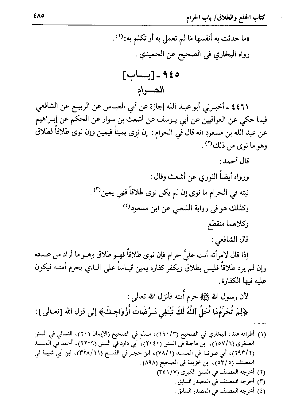 4461 - أخبرني أبو عبد الله إجازة عن أبي العباس عن الربيع عن الشافعي فيما حكي عن العراقيين عن أبي يوسف عن أشعث بن سوار عن الحكم عن إبراهيم عن عبد الله بن مسعود أنه قال في الحرام : إن نوى يميناً فيمين وإن نوى طلاقاً فطلاق وهو ما نوى من ذلك.