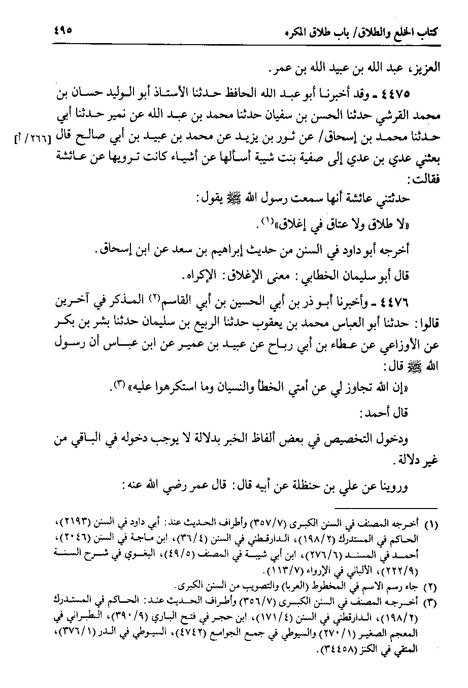 4475 - وقد أخبرنا أبو عبد الله الحافظ حدثنا الأستاذ أبو الوليد حسان بن محمد القرشي حدثنا الحسن بن سفيان حدثنا محمد بن عبد الله عن نمير حدثنا أبي حدثنا محمد بن إسحاق عن ثور بن يزيد عن محمد بن عبيد بن أبي صالح قال بعثني عدي بن عدي إلى صفية بنت شيبة أسألها عن أشياء كانت ترويها عن عائشة قالت حدثتني عائشة أنها سمعت رسول الله صلى الله عليه وسلم يقول لا طلاق ولا عتاق في إغلاق.