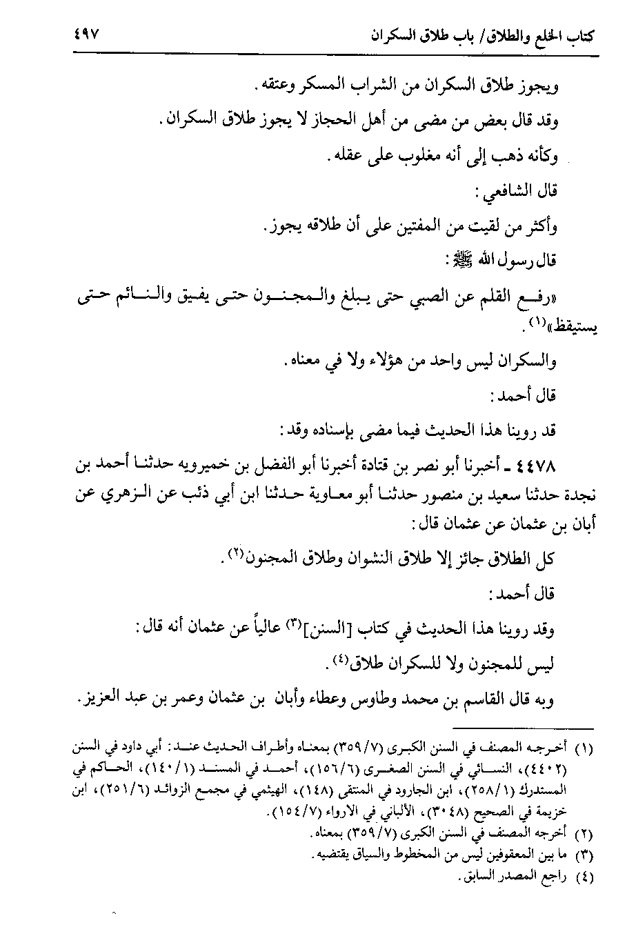 قال أحمد قد روينا هذا الحديث فيما مضى بإسناده وقد 4478 - أخبرنا أبو نصر بن قتادة أخبرنا أبو الفضل بن خميرويه حدثنا أحمد بن نجدة حدثنا سعيد بن منصور حدثنا أبو معاوية حدثنا ابن أبي ذئب عن الزهري عن أبان بن عثمان عن عثمان قال كل الطلاق جائز إلا طلاق النشوان وطلاق المجنون.