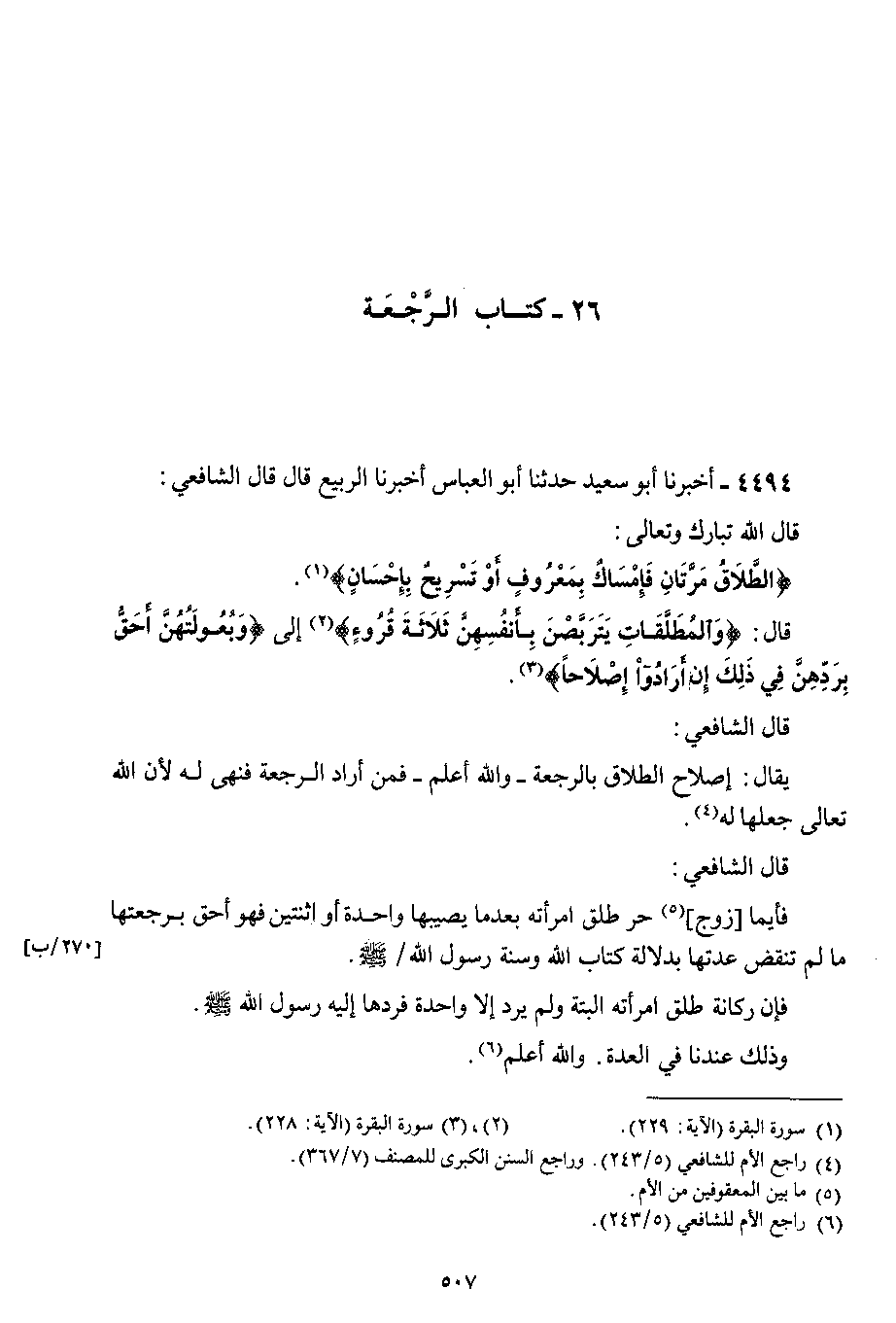4494 - أخبرنا أبو سعيد حدثنا أبو العباس أخبرنا الربيع قال قال الشافعي قال الله تبارك وتعالى {الطلاق مرتان فإمساك بمعروف أو تسريح بإحسان} قال : {والمطلقات يتربصن بأنفسهن ثلاثة قروء} إلى {وبعولتهن أحق بردهن في ذلك إن أرادوا إصلاحا} قال الشافعي يقال : إصلاح الطلاق بالرجعة - والله أعلم - فمن أراد الرجعة فنهى له لأن الله تعالى جعلها له.