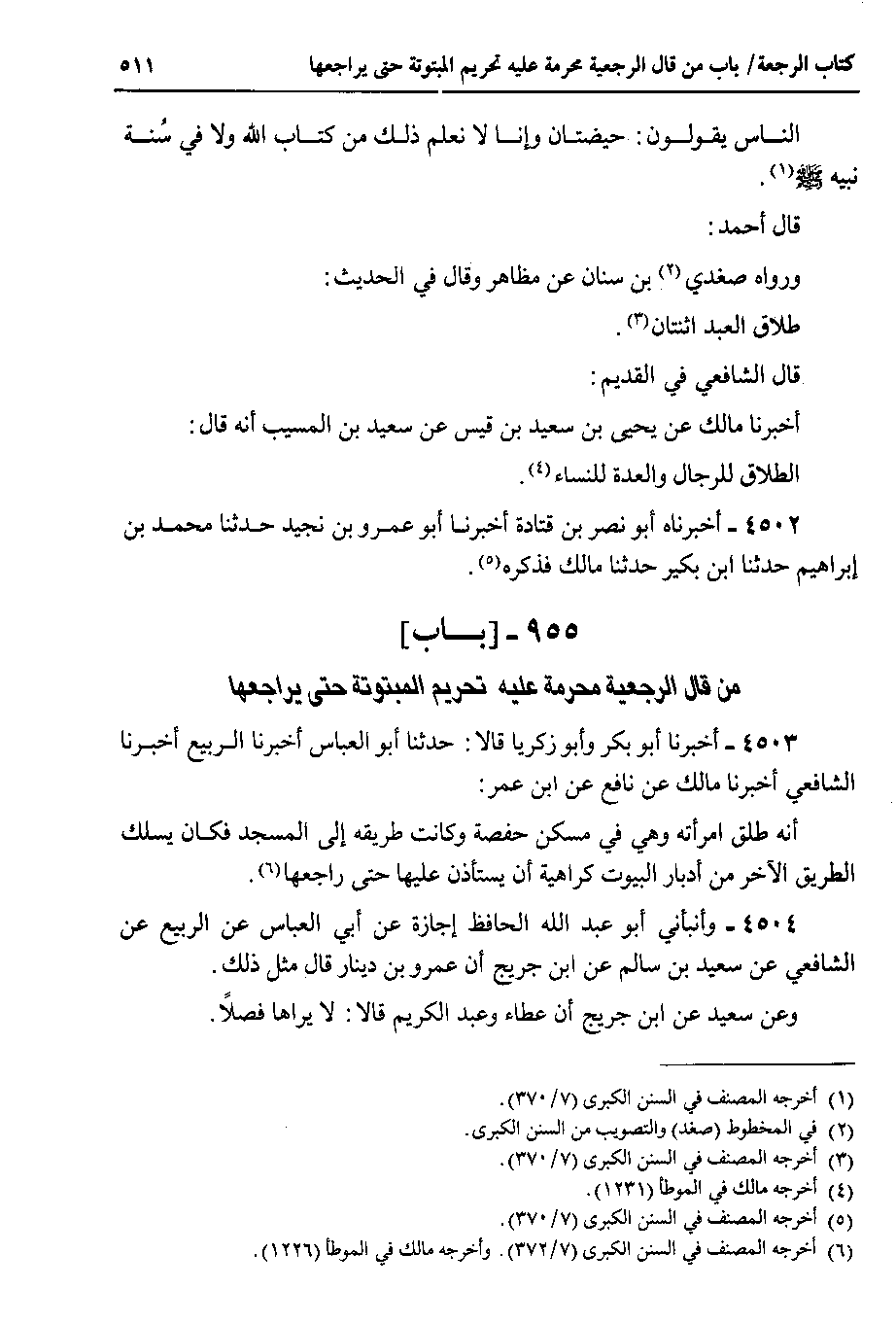 955 - باب من قال الرجعية محرمة عليه تحريم المبتوتة حتى يراجعها ) 4503 - أخبرنا أبو بكر وأبو زكريا قالا : حدثنا أبو العباس أخبرنا الربيع أخبرنا الشافعي أخبرنا مالك عن نافع عن ابن عمر أنه طلق امرأته وهي في مسكن حفصة وكانت طريقه إلى المسجد فكان يسلك الطريق الآخر من أدبار البيوت كراهية أن يستأذن عليها حتى راجعها.