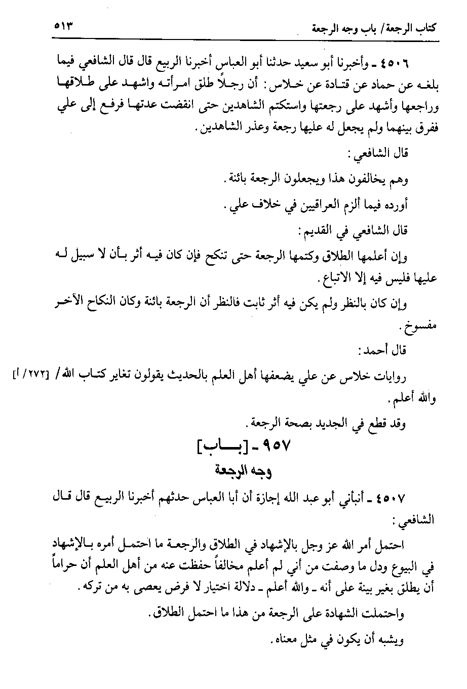 4507 - أنبأني أبو عبد الله إجازة أن أبا العباس حدثهم أخبرنا الربيع قال قال الشافعي احتمل أمر الله عز وجل بالإشهاد في الطلاق والرجعة ما احتمل أمره بالإشهاد في البيوع ودل ما وصفت من أني لم أعلم مخالفاً حفظت عنه من أهل العلم أن حراماً أن يطلق بغير بينة على أنه - والله أعلم - دلالة اختيار لا فرض يعصى به من تركه.