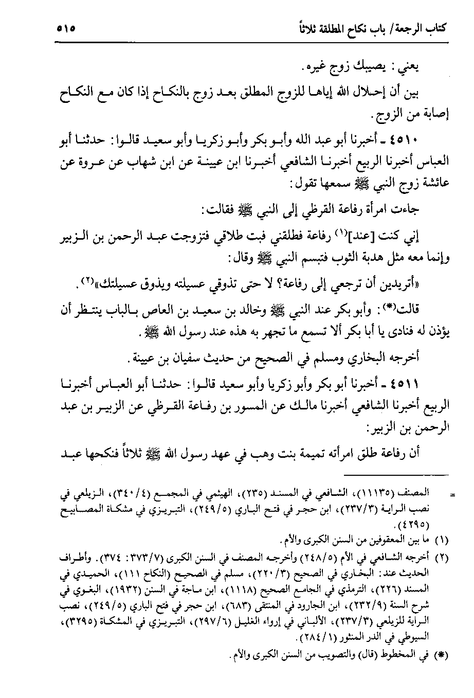 4511 - أخبرنا أبو بكر وأبو زكريا وأبو سعيد قالوا : حدثنا أبو العباس أخبرنا الربيع أخبرنا الشافعي أخبرنا مالك عن المسور بن رفاعة القرظي عن الزبير بن عبد الرحمن بن الزبير أن رفاعة طلق امرأته تميمة بنت وهب في عهد رسول الله صلى الله عليه وسلم ثلاثاً فنكحها عبد