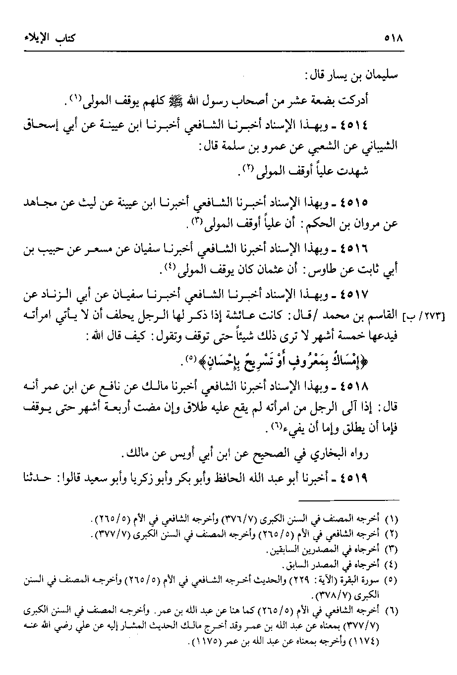 4517 - وبهذا الإسناد أخبرنا الشافعي أخبرنا سفيان عن أبي الزناد عن القاسم بن محمد قال : كانت عائشة إذا ذكر لها الرجل يحلف أن لا يأتي امرأته فيدعها خمسة أشهر لا ترى ذلك شيئاً حتى توقف وتقول : كيف قال الله {إمساك بمعروف أو تسريح بإحسان} 4518 - وبهذا الإسناد أخبرنا الشافعي أخبرنا مالك عن نافع عن ابن عمر أنه قال : إذا آلى الرجل من امرأته لم يقع عليه طلاق وإن مضت أربعة أشهر حتى يوقف فإما أن يطلق وإما أن يفيء.