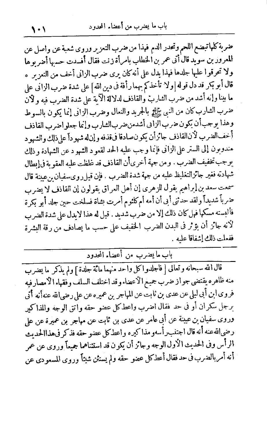ضَرْبَةً كُلُّهَا تُبْضِعُ اللَّحْمَ وَتَحْدُرُ الدَّمَ فَهَذَا مِنْ ضَرْبِ التَّعْزِيرِ وَرَوَى شُعْبَةُ عَنْ وَاصِلٍ عَنْ الْمَعْرُورِ بْنِ سُوَيْد قَالَ أُتِيَ عُمَرُ بْنُ الْخَطَّابِ بِامْرَأَةٍ زَنَتْ فَقَالَ أَفْسَدَتْ حَسَبَهَا اضْرِبُوهَا وَلَا تُحْرِقُوا عَلَيْهَا جِلْدَهَا فَهَذَا يَدُلُّ عَلَى أَنَّهُ كَانَ يَرَى ضَرْبَ الزَّانِي أَخَفَّ مِنْ التَّعْزِيرِ قَالَ أَبُو بَكْرٍ قَدْ دَلَّ قَوْلُهُ وَلا تَأْخُذْكُمْ بِهِما رَأْفَةٌ فِي دِينِ اللَّهِ عَلَى شِدَّةِ ضَرْبِ الزَّانِي عَلَى مَا بَيَّنَّا وَأَنَّهُ أَشَدُّ مِنْ ضَرْبِ الشَّارِبِ وَالْقَاذِفِ لِدَلَالَةِ الْآيَةِ عَلَى شِدَّةِ الضَّرْبِ فِيهِ وَلِأَنَّ ضَرْبَ الشَّارِبِ كَانَ مِنْ النَّبِيِّ صَلَّى اللَّهُ عَلَيْهِ وَسَلَّمَ بِالْجَرِيدِ وَالنِّعَالِ وَضَرْبُ الزَّانِي إنَّمَا يَكُونُ بِالسَّوْطِ وَهَذَا يُوجِبُ أَنْ يَكُونَ ضَرْبُ الزَّانِي أَشَدَّ مِنْ ضَرْبِ الشَّارِبِ وَإِنَّمَا جَعَلُوا ضَرْبَ الْقَاذِفِ أَخَفَّ الضَّرْبِ لِأَنَّ الْقَاذِفَ جَائِزٌ أَنْ يَكُونَ صَادِقًا فِي قَذْفِهِ وَأَنَّ لَهُ شُهُودًا عَلَى ذَلِكَ وَالشُّهُودُ مَنْدُوبُونَ إلَى السَّتْرِ عَلَى الزَّانِي فَإِنَّمَا وَجَبَ عَلَيْهِ الْحَدُّ لِقُعُودِ الشُّهُودِ عَنْ الشَّهَادَةِ وَذَلِكَ يُوجِبُ تَخْفِيفَ الضَّرْبِ. وَمِنْ جِهَةٍ أُخْرَى أَنَّ الْقَاذِفَ قَدْ غُلِّظَتْ عَلَيْهِ الْعُقُوبَةُ فِي إبْطَالِ شَهَادَتِهِ فَغَيْرُ جَائِزٍ التَّغْلِيظُ عَلَيْهِ مِنْ جِهَةِ شِدَّةِ الضَّرْبِ. فَإِنْ قِيلَ رَوَى سُفْيَانُ بْنُ عُيَيْنَةَ قَالَ سَمِعْت سَعْدَ بْنَ إبْرَاهِيمَ يَقُولُ لِلزُّهْرِيِّ إنَّ أَهْلَ الْعِرَاقِ يَقُولُونَ إنَّ الْقَاذِفَ لَا يُضْرَبُ ضَرْبًا شَدِيدًا وَلَقَدْ حَدَّثَنِي أَبِي أَنَّ أُمَّهُ أُمَّ كُلْثُومٍ أَمَرَتْ بِشَاةٍ فَسُلِخَتْ حِينَ جُلِدَ أَبُو بَكْرَةَ فَأَلْبَسَتْهُ مَسْكَهَا فَهَلْ كَانَ ذَلِكَ إلَّا مِنْ ضَرْبٍ شَدِيدٍ. قِيلَ لَهُ هَذَا لَا يَدُلُّ عَلَى شِدَّةِ الضَّرْبِ لِأَنَّهُ جَائِزٌ أَنْ يُؤَثِّرَ فِي الْبَدَنِ الضَّرْبُ الْخَفِيفُ عَلَى حَسَبِ مَا يُصَادِفُ مِنْ رِقَّةِ الْبَشَرَةِ فَفَعَلَتْ ذَلِكَ إشْفَاقًا عَلَيْهِ.