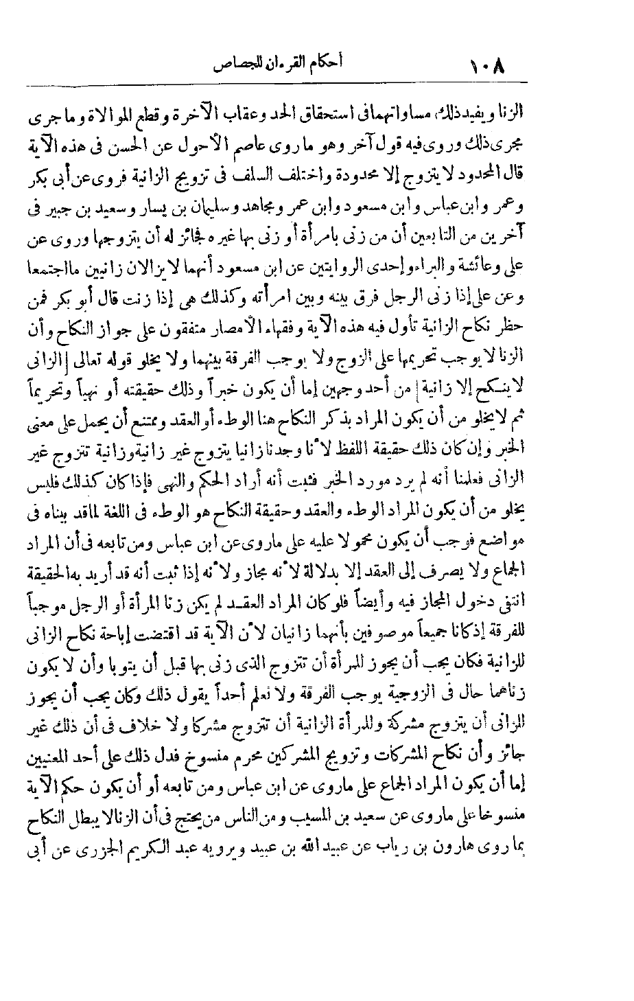 الزِّنَا وَيُفِيدُ ذَلِكَ مُسَاوَاتَهُمَا فِي اسْتِحْقَاقِ الْحَدِّ وَعِقَابِ الْآخِرَةِ وَقَطْعِ الْمُوَالَاةِ وَمَا جَرَى مَجْرَى ذَلِكَ وَرُوِيَ فِيهِ قَوْلٌ آخَرُ وَهُوَ مَا رَوَى عَاصِمُ الْأَحْوَلُ عَنْ الْحَسَنِ فِي هَذِهِ الْآيَةِ قَالَ الْمَحْدُودُ لَا يَتَزَوَّجُ إلَّا مَحْدُودَةً وَاخْتَلَفَ السَّلَفُ فِي تَزْوِيجِ الزَّانِيَةِ فَرُوِيَ عَنْ أَبِي بَكْرٍ وَعُمَرَ وَابْنِ عَبَّاسٍ وَابْنِ مَسْعُودٍ وَابْنِ عُمَرَ وَمُجَاهِدٍ وَسُلَيْمَانَ بْنِ يَسَارٍ وَسَعِيدِ بْنِ جُبَيْرٍ فِي آخَرِينَ مِنْ التَّابِعِينَ أَنَّ مَنْ زَنَى بِامْرَأَةٍ أَوْ زَنَى بِهَا غَيْرُهُ فَجَائِزٌ لَهُ أَنْ يَتَزَوَّجَهَا وَرُوِيَ عَنْ عَلِيٍّ وَعَائِشَةَ وَالْبَرَاءِ وَإِحْدَى الرِّوَايَتَيْنِ عَنْ ابْنِ مَسْعُودٍ أَنَّهُمَا لَا يَزَالَانِ زَانِيَيْنِ مَا اجْتَمَعَا