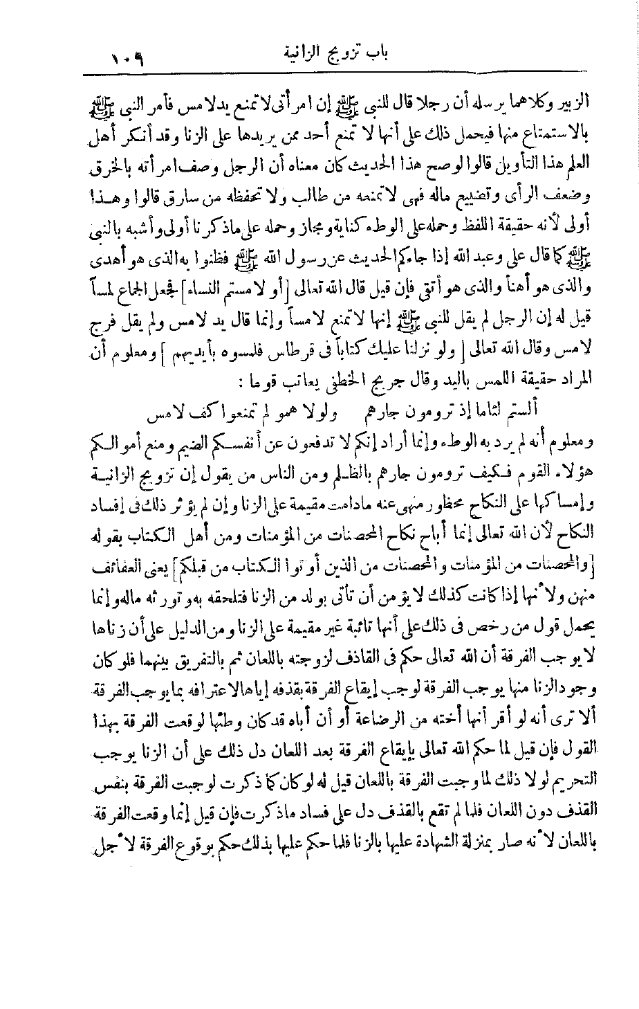 وَمَعْلُومٌ أَنَّهُ لَمْ يُرِدْ بِهِ الْوَطْءَ وَإِنَّمَا أَرَادَ أَنَّكُمْ لَا تَدْفَعُونَ عَنْ أَنْفُسِكُمْ الضَّيْمَ وَمَنَعَ أَمْوَالَكُمْ هَؤُلَاءِ الْقَوْمُ فَكَيْفَ تَرُومُونَ جَارَهُمْ بِالظُّلْمِ وَمِنْ النَّاسِ مَنْ يَقُولُ إنَّ تَزْوِيجَ الزَّانِيَةِ وَإِمْسَاكَهَا عَلَى النكاح محظور منهى عنه مادامت مُقِيمَةً عَلَى الزِّنَا وَإِنْ لَمْ يُؤَثِّرْ ذَلِكَ فِي إفْسَادِ النِّكَاحِ لِأَنَّ اللَّهَ تَعَالَى إنَّمَا أَبَاحَ نِكَاحَ الْمُحْصَنَاتِ مِنْ الْمُؤْمِنَاتِ وَمِنْ أَهْلِ الْكِتَابِ بِقَوْلِهِ وَالْمُحْصَناتُ مِنَ الْمُؤْمِناتِ وَالْمُحْصَناتُ مِنَ الَّذِينَ أُوتُوا الْكِتابَ مِنْ قَبْلِكُمْ يَعْنِي الْعَفَائِفَ مِنْهُنَّ وَلِأَنَّهَا إذَا كَانَتْ كَذَلِكَ لَا يُؤْمَنُ أَنْ تَأْتِيَ بِوَلَدٍ مِنْ الزِّنَا فَتُلْحِقَهُ بِهِ وَتُوَرِّثَهُ مَالَهُ وَإِنَّمَا يُحْمَلُ قَوْلُ مَنْ رَخَّصَ فِي ذَلِكَ عَلَى أَنَّهَا تَائِبَةٌ غَيْرُ مُقِيمَةٍ عَلَى الزِّنَا وَمِنْ الدَّلِيلِ عَلَى أَنَّ زِنَاهَا لَا يُوجِبُ الْفُرْقَةَ أَنَّ اللَّهَ تَعَالَى حَكَمَ فِي الْقَاذِفِ لِزَوْجَتِهِ بِاللِّعَانِ ثُمَّ بِالتَّفْرِيقِ بَيْنَهُمَا فَلَوْ كَانَ وُجُودُ الزِّنَا مِنْهَا يوجب الفرقة لوجب إيقاع الفرقة بقذفه إياها لا عترافه بِمَا يُوجِبُ الْفُرْقَةَ أَلَا تَرَى أَنَّهُ لَوْ أَقَرَّ أَنَّهَا أُخْتُهُ مِنْ الرَّضَاعَةِ أَوْ أَنَّ أَبَاهُ قَدْ كَانَ وَطِئَهَا لَوَقَعَتْ الْفُرْقَةُ بِهَذَا الْقَوْلِ فَإِنْ قِيلَ لَمَّا حَكَمَ اللَّهُ تَعَالَى بِإِيقَاعِ الْفُرْقَةِ بَعْدَ اللِّعَانِ دَلَّ ذَلِكَ عَلَى أَنَّ الزِّنَا يُوجِبُ التَّحْرِيمَ لَوْلَا ذَلِكَ لَمَا وَجَبَتْ الْفُرْقَةُ بِاللِّعَانِ قِيلَ لَهُ لَوْ كَانَ كَمَا ذَكَرْت لَوَجَبَتْ الْفُرْقَةُ بِنَفْسِ الْقَذْفِ دُونَ اللِّعَانِ فَلَمَّا لَمْ تَقَعْ بِالْقَذْفِ دَلَّ عَلَى فَسَادِ مَا ذَكَرْت فَإِنْ قِيلَ إنَّمَا وَقَعَتْ الْفُرْقَةُ بِاللِّعَانِ لِأَنَّهُ صَارَ بِمَنْزِلَةِ الشَّهَادَةِ عَلَيْهَا بِالزِّنَا فَلَمَّا حُكِمَ عَلَيْهَا بِذَلِكَ حُكِمَ بِوُقُوعِ الفرقة لأجل