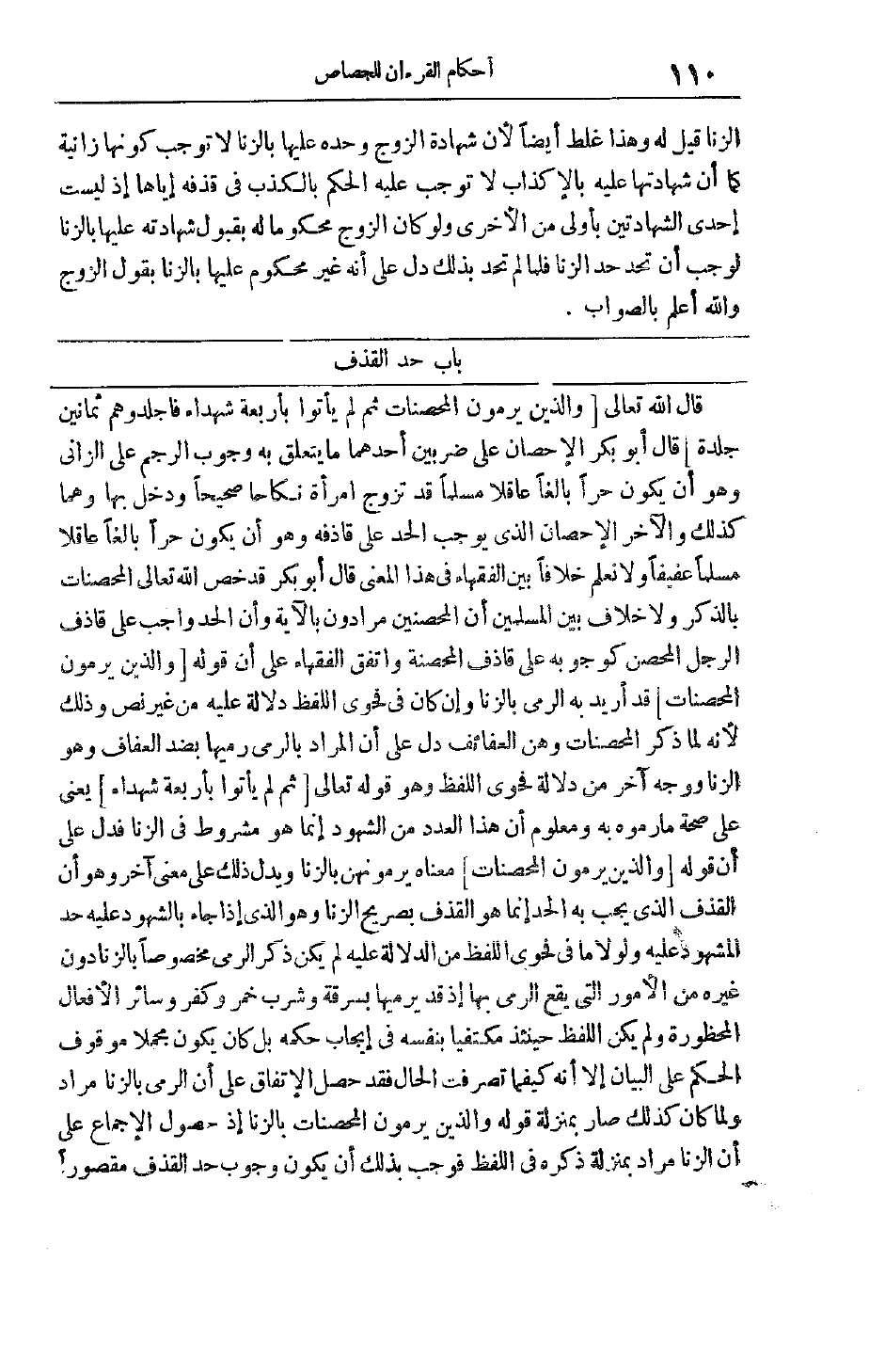قَالَ اللَّهُ تَعَالَى وَالَّذِينَ يَرْمُونَ الْمُحْصَناتِ ثُمَّ لَمْ يَأْتُوا بِأَرْبَعَةِ شُهَداءَ فَاجْلِدُوهُمْ ثَمانِينَ جَلْدَةً قَالَ أَبُو بَكْرٍ الْإِحْصَانُ عَلَى ضَرْبَيْنِ أَحَدُهُمَا مَا يَتَعَلَّقُ بِهِ وُجُوبُ الرَّجْمِ عَلَى الزَّانِي وَهُوَ أَنْ يَكُونَ حُرًّا بَالِغًا عَاقِلًا مُسْلِمًا قَدْ تَزَوَّجَ امْرَأَةً نِكَاحًا صَحِيحًا وَدَخَلَ بِهَا وَهُمَا كَذَلِكَ وَالْآخَرُ الْإِحْصَانُ الَّذِي يُوجِبُ الْحَدَّ عَلَى قَاذِفِهِ وَهُوَ أَنْ يَكُونَ حُرًّا بَالِغًا عَاقِلًا مُسْلِمًا عَفِيفًا وَلَا نَعْلَمُ خِلَافًا بَيْنَ الْفُقَهَاءِ فِي هَذَا الْمَعْنَى قَالَ أَبُو بَكْرٍ قَدْ خَصَّ اللَّهُ تَعَالَى الْمُحْصَنَاتِ بِالذِّكْرِ وَلَا خِلَافَ بَيْنَ الْمُسْلِمِينَ أَنَّ الْمُحْصَنِينَ مُرَادُونَ بِالْآيَةِ وَأَنَّ الْحَدَّ وَاجِبٌ عَلَى قَاذِفِ الرَّجُلِ الْمُحْصَنِ كَوُجُوبِهِ عَلَى قَاذِفِ الْمُحْصَنَةِ وَاتَّفَقَ الْفُقَهَاءُ عَلَى أن قوله وَالَّذِينَ يَرْمُونَ الْمُحْصَناتِ قَدْ أُرِيدَ بِهِ الرَّمْيُ بِالزِّنَا وَإِنْ كَانَ فِي فَحْوَى اللَّفْظِ دَلَالَةٌ عَلَيْهِ مِنْ غَيْرِ نَصٍّ وَذَلِكَ لِأَنَّهُ لَمَّا ذَكَرَ الْمُحْصَنَاتِ وَهُنَّ الْعَفَائِفُ دَلَّ عَلَى أَنَّ الْمُرَادَ بِالرَّمْيِ رَمْيُهَا بِضِدِّ الْعَفَافِ وَهُوَ الزِّنَا وَوَجْهٌ آخَرُ مِنْ دَلَالَةِ فَحْوَى اللَّفْظِ وَهُوَ قَوْله تَعَالَى ثُمَّ لَمْ يَأْتُوا بِأَرْبَعَةِ شُهَداءَ يَعْنِي عَلَى صِحَّةِ مَا رَمَوْهُ بِهِ وَمَعْلُومٌ أَنَّ هَذَا الْعَدَدَ مِنْ الشُّهُودِ إنَّمَا هُوَ مَشْرُوطٌ فِي الزِّنَا فَدَلَّ عَلَى أَنَّ قَوْلَهُ وَالَّذِينَ يَرْمُونَ الْمُحْصَناتِ مَعْنَاهُ يَرْمُونَهُنَّ بِالزِّنَا وَيَدُلُّ ذَلِكَ عَلَى مَعْنًى آخَرَ وَهُوَ أَنَّ الْقَذْفَ الَّذِي يَجِبُ بِهِ الْحَدُّ إنَّمَا هُوَ الْقَذْفُ بِصَرِيحِ الزِّنَا وَهُوَ الَّذِي إذَا جَاءَ بِالشُّهُودِ عَلَيْهِ حُدَّ الْمَشْهُودُ عَلَيْهِ وَلَوْلَا مَا فِي فَحْوَى اللَّفْظِ مِنْ الدَّلَالَةِ عَلَيْهِ لَمْ يَكُنْ ذِكْرُ الرَّمْيِ مَخْصُوصًا بِالزِّنَا دُونَ غَيْرِهِ مِنْ الْأُمُورِ الَّتِي يَقَعُ الرَّمْيُ بِهَا إذْ قَدْ يَرْمِيهَا بِسَرِقَةٍ وَشُرْبِ خَمْرٍ وَكُفْرٍ وَسَائِرِ الْأَفْعَالِ الْمَحْظُورَةِ وَلَمْ يَكُنْ اللَّفْظُ حِينَئِذٍ مُكْتَفِيًا بِنَفْسِهِ فِي إيجَابِ حُكْمِهِ بَلْ كَانَ يَكُونُ مُجْمَلًا مَوْقُوفَ الْحُكْمِ عَلَى الْبَيَانِ إلَّا أَنَّهُ كَيْفَمَا تَصَرَّفَتْ الْحَالُ فَقَدْ حَصَلَ الِاتِّفَاقُ عَلَى أَنَّ الرَّمْيَ بِالزِّنَا مُرَادٌ وَلَمَّا كَانَ كَذَلِكَ صَارَ بِمَنْزِلَةِ قَوْلِهِ وَاَلَّذِينَ يَرْمُونَ الْمُحْصَنَاتِ بِالزِّنَا إذْ حُصُولُ الْإِجْمَاعِ عَلَى أَنَّ الزِّنَا مُرَادٌ بِمَنْزِلَةِ ذِكْرِهِ فِي اللَّفْظِ فَوَجَبَ بِذَلِكَ أَنْ يَكُونَ وُجُوبُ حَدِّ الْقَذْفِ مقصورا
