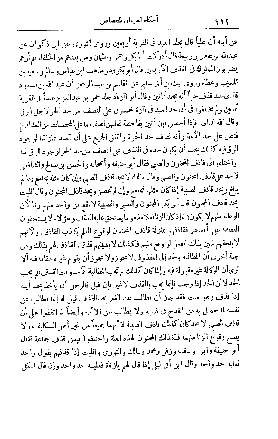 وَرَوَى الثَّوْرِيُّ عَنْ ابْنِ ذَكْوَانَ عَنْ عَبْدِ اللَّهِ بْنِ عَامِرِ بْنِ رَبِيعَة قَالَ أَدْرَكْت أَبَا بَكْرٍ وَعُمَرَ وَعُثْمَانَ وَمَنْ بَعْدَهُمْ مِنْ الْخُلَفَاءِ فَلَمْ أَرَهُمْ يَضْرِبُونَ المملوك في القذف الأربعين قَالَ أَبُو بَكْرٍ وَهُوَ مَذْهَبُ ابْنِ عَبَّاسٍ وَسَالِمٍ وَسَعِيدِ بْنِ الْمُسَيِّبِ وَعَطَاءٍ وَرَوَى لَيْثُ بْنُ أَبِي سُلَيْمٍ عَنْ الْقَاسِمِ بْنِ عَبْدِ الرَّحْمَنِ أَنَّ عَبْدَ اللَّهِ بْنَ مَسْعُودٍ قَالَ فِي عَبْدٍ قَذَفَ حُرًّا إنَّهُ يُجْلَدُ ثَمَانِينَ وَقَالَ أَبُو الزِّنَادِ جَلَدَ عُمَرُ بْنُ عَبْدِ الْعَزِيزِ عَبْدًا فِي الْفِرْيَةِ ثَمَانِينَ وَلَمْ يَخْتَلِفُوا فِي أَنَّ حَدَّ الْعَبْدِ فِي الزِّنَا خَمْسُونَ عَلَى النِّصْفِ مِنْ حَدِّ الْحُرِّ لِأَجْلِ الرِّقِّ وَقَالَ اللَّهُ تَعَالَى فَإِذا أُحْصِنَّ فَإِنْ أَتَيْنَ بِفاحِشَةٍ فَعَلَيْهِنَّ نِصْفُ مَا عَلَى الْمُحْصَناتِ مِنَ الْعَذابِ فَنَصَّ عَلَى حَدِّ الْأَمَةِ وَأَنَّهُ نِصْفُ حَدِّ الْحُرَّةِ وَاتَّفَقَ الْجَمِيعُ عَلَى أَنَّ الْعَبْدَ بِمَنْزِلَتِهَا لِوُجُودِ الرِّقِّ فِيهِ كَذَلِكَ يَجِبُ أَنْ يَكُونَ حَدُّهُ فِي الْقَذْفِ عَلَى النِّصْفِ مِنْ حَدِّ الْحُرِّ لِوُجُودِ الرِّقِّ فِيهِ وَاخْتَلَفُوا فِي قَاذِفِ الْمَجْنُونِ وَالصَّبِيِّ فَقَالَ أَبُو حَنِيفَةَ وَأَصْحَابُهُ وَالْحَسَنُ بْنُ صَالِحٍ والشافعى لاحد عَلَى قَاذِفِ الْمَجْنُونِ وَالصَّبِيِّ وَقَالَ مَالِكٌ لَا يُحَدُّ قَاذِفُ الصَّبِيِّ وَإِنْ كَانَ مِثْلُهُ يُجَامِعُ إذَا لَمْ يَبْلُغْ وَيُحَدُّ قَاذِفُ الصَّبِيَّةِ إذَا كَانَ مِثْلُهَا تُجَامَعُ وَإِنْ لَمْ تُحْصَنْ وَيُحَدُّ قَاذِفُ الْمَجْنُونِ وَقَالَ اللَّيْثُ يُحَدُّ قَاذِفُ الْمَجْنُونِ قَالَ أَبُو بَكْرٍ الْمَجْنُونُ وَالصَّبِيُّ وَالصَّبِيَّةُ لَا يَقَعُ مِنْ وَاحِدٍ مِنْهُمْ زِنًا لِأَنَّ الْوَطْءَ مِنْهُمْ لَا يَكُونُ زِنًا إذْ كَانَ الزِّنَا فِعْلًا مَذْمُومًا يَسْتَحِقُّ عَلَيْهِ الْعِقَابَ وَهَؤُلَاءِ لَا يَسْتَحِقُّونَ الْعِقَابَ عَلَى أَفْعَالِهِمْ فَقَاذِفُهُمْ بِمَنْزِلَةِ قَاذِفِ الْمَجْنُونِ لِوُقُوعِ الْعِلْمِ بِكَذِبِ الْقَاذِفِ وَلِأَنَّهُمْ لَا يَلْحَقُهُمْ شَيْنٌ بِذَلِكَ الْفِعْلِ لَوْ وَقَعَ مِنْهُمْ فَكَذَلِكَ لَا يَشِينُهُمْ قَذْفُ الْقَاذِفِ لَهُمْ بِذَلِكَ وَمِنْ جِهَةٍ أُخْرَى أَنَّ الْمُطَالَبَةَ بِالْحَدِّ إلَى المقذوف لا تجوز وَلَا يَجُوزُ أَنْ يَقُومَ غَيْرُهُ مَقَامَهُ فِيهِ أَلَا تَرَى أَنَّ الْوَكَالَةَ غَيْرُ مَقْبُولَةٍ فِيهِ وَإِذَا كَانَ كَذَلِكَ لَمْ تَجِبْ الْمُطَالَبَةُ لِأَحَدٍ وَقْتَ الْقَذْفِ فَلَمْ يَجِبْ الْحَدُّ لِأَنَّ الْحَدَّ إذَا وَجَبَ فَإِنَّمَا يَجِبُ بِالْقَذْفِ لَا غَيْرَ فَإِنْ قِيلَ فَلِلرَّجُلِ أَنْ يَأْخُذَ بِحَدِّ أَبِيهِ إذَا قُذِفَ وَهُوَ مَيِّتٌ فَقَدْ جَازَ أَنْ يُطَالِبَ عَنْ الْغَيْرِ بِحَدِّ الْقَذْفِ قِيلَ لَهُ إنَّمَا يُطَالِبُ عَنْ نَفْسِهِ لِمَا حَصَلَ بِهِ مِنْ الْقَدْحِ فِي نَسَبِهِ وَلَا يُطَالِبُ عَنْ الْأَبِ وَأَيْضًا لَمَّا اتَّفَقُوا عَلَى أَنَّ قَاذِفَ الصبى لا بحد كَانَ كَذَلِكَ قَاذِفُ الصَّبِيَّةِ لِأَنَّهُمَا جَمِيعًا مِنْ غَيْرِ أَهْلِ التَّكْلِيفِ وَلَا يَصِحُّ وُقُوعُ الزِّنَا مِنْهُمَا فَكَذَلِكَ الْمَجْنُونُ لِهَذِهِ الْعِلَّةِ وَاخْتَلَفُوا فِيمَنْ قَذَفَ جَمَاعَةً فَقَالَ أَبُو حَنِيفَةَ وَأَبُو يُوسُفَ وَزُفَرُ وَمُحَمَّدٌ وَمَالِكٌ وَالثَّوْرِيُّ وَاللَّيْثُ إذَا قَذَفَهُمْ بِقَوْلٍ وَاحِدٍ فَعَلَيْهِ حَدٌّ وَاحِدٌ وَقَالَ ابْنُ أَبِي لَيْلَى إذَا قَالَ لَهُمْ يَا زُنَاةُ فَعَلَيْهِ حَدٌّ وَاحِدٌ وَإِنْ قَالَ لِكُلِّ