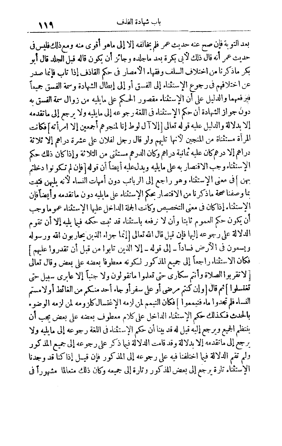 بَعْدَ التَّوْبَةِ فَإِنْ صَحَّ عَنْهُ حَدِيثُ عُمَرَ فَلَمْ يُخَالِفْهُ إلَّا إلَى مَا هُوَ أَقْوَى مِنْهُ وَمَعَ ذَلِكَ فَلَيْسَ فِي حَدِيثِ عُمَرَ أنه قال ذلك لأبى بكرة بعد ما جلده وجائز أن يكون قاله قبل الجلد قال أبو بكر ما ذَكَرْنَا مِنْ اخْتِلَافِ السَّلَفِ وَفُقَهَاءِ الْأَمْصَارِ فِي حُكْمِ الْقَاذِفِ إذَا تَابَ فَإِنَّمَا صَدَرَ عَنْ اخْتِلَافِهِمْ فِي رُجُوعِ الِاسْتِثْنَاءِ إلَى الْفِسْقِ أَوْ إلَى إبْطَالِ الشَّهَادَةِ وَسِمَةِ الْفِسْقِ جَمِيعًا فَيَرْفَعُهُمَا وَالدَّلِيلُ عَلَى أَنَّ الِاسْتِثْنَاءَ مَقْصُورُ الْحُكْمِ عَلَى مَا يَلِيهِ مِنْ زَوَالِ سِمَةِ الْفِسْقِ بِهِ دُونَ جَوَازِ الشَّهَادَةِ أَنَّ حُكْمَ الِاسْتِثْنَاءِ فِي اللُّغَةِ رُجُوعُهُ إلَى مَا يَلِيهِ وَلَا يَرْجِعُ إلَى مَا تَقَدَّمَهُ إلَّا بِدَلَالَةٍ وَالدَّلِيلُ عَلَيْهِ قَوْله تَعَالَى إِلَّا آلَ لُوطٍ إِنَّا لَمُنَجُّوهُمْ أَجْمَعِينَ إِلَّا امْرَأَتَهُ فَكَانَتْ الْمَرْأَةُ مُسْتَثْنَاةً مِنْ الْمُنَجَّيْنَ لِأَنَّهَا تَلِيهِمْ وَلَوْ قَالَ رَجُلٌ لِفُلَانٍ عَلَيَّ عَشَرَةُ دَرَاهِمَ إلَّا ثَلَاثَةَ دَرَاهِمَ إلَّا دِرْهَمٌ كَانَ عَلَيْهِ ثَمَانِيَةُ دَرَاهِمَ وَكَانَ الدِّرْهَمُ مُسْتَثْنًى مِنْ الثَّلَاثَةِ وَإِذَا كَانَ ذَلِكَ حُكْمَ الِاسْتِثْنَاءِ وَجَبَ الِاقْتِصَارُ بِهِ عَلَى مَا يَلِيهِ وَيَدُلُّ عَلَيْهِ أَيْضًا أَنَّ قَوْلَهُ فَإِنْ لَمْ تَكُونُوا دَخَلْتُمْ بِهِنَّ فِي مَعْنَى الِاسْتِثْنَاءِ وَهُوَ رَاجِعٌ إلَى الرَّبَائِبِ دُونَ أُمَّهَاتِ النِّسَاءِ لِأَنَّهُ يَلِيهِنَّ فَثَبَتَ بِمَا وَصَفْنَا صِحَّةُ مَا ذَكَرْنَا مِنْ الِاقْتِصَارِ بِحُكْمِ الِاسْتِثْنَاءِ عَلَى مَا يَلِيهِ دُونَ مَا تَقَدَّمَهُ وَأَيْضًا فَإِنَّ الِاسْتِثْنَاءَ إذَا كَانَ فِي مَعْنَى التَّخْصِيصِ وَكَانَتْ الْجُمْلَةُ الدَّاخِلُ عَلَيْهَا الِاسْتِثْنَاءُ عُمُومًا وَجَبَ أَنْ يَكُونَ حُكْمُ الْعُمُومِ ثَابِتًا وَأَنْ لَا نَرْفَعَهُ بِاسْتِثْنَاءٍ قَدْ ثَبَتَ حُكْمُهُ فِيمَا يَلِيهِ إلَّا أَنْ تَقُومَ الدَّلَالَةُ عَلَى رُجُوعِهِ إلَيْهَا فَإِنْ قِيلَ قَالَ اللَّهُ تَعَالَى إِنَّما جَزاءُ الَّذِينَ يُحارِبُونَ اللَّهَ وَرَسُولَهُ وَيَسْعَوْنَ فِي الْأَرْضِ فَساداً- إلَى قَوْلِهِ- إِلَّا الَّذِينَ تابُوا مِنْ قَبْلِ أَنْ تَقْدِرُوا عَلَيْهِمْ فَكَانَ