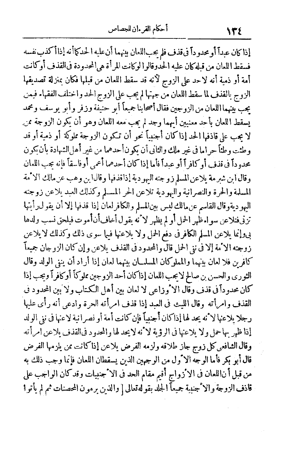 إذَا كَانَ عَبْدًا أَوْ مَحْدُودًا فِي قَذْفٍ فَلَمْ يَجِبْ اللِّعَانُ بَيْنَهُمَا أَنَّ عَلَيْهِ الْحَدَّ كَمَا أَنَّهُ إذَا أَكْذَبَ نَفْسَهُ فَسَقَطَ اللِّعَانُ مِنْ قِبَلِهِ كَانَ عَلَيْهِ الْحَدُّ وَقَالُوا لَوْ كَانَتْ الْمَرْأَةُ هِيَ الْمَحْدُودَةُ فِي الْقَذْفِ أَوْ كَانَتْ أَمَةً أَوْ ذِمِّيَّةً أَنَّهُ لَا حَدَّ عَلَى الزَّوْجِ لِأَنَّهُ قَدْ سَقَطَ اللِّعَانُ مِنْ قِبَلِهَا فَكَانَ بِمَنْزِلَةِ تَصْدِيقِهَا الزَّوْجَ بِالْقَذْفِ لَمَّا سَقَطَ اللِّعَانُ مِنْ جِهَتِهَا لَمْ يَجِبْ عَلَى الزَّوْجِ الْحَدُّ وَاخْتَلَفَ الْفُقَهَاءُ فِيمَنْ يَجِبُ بَيْنَهُمَا اللِّعَانُ مِنْ الزَّوْجَيْنِ فَقَالَ أَصْحَابُنَا جَمِيعًا أَبُو حَنِيفَةَ وَزُفَرُ وَأَبُو يُوسُفَ وَمُحَمَّدٌ يَسْقُطُ اللِّعَانُ بِأَحَدِ مَعْنَيَيْنِ أَيُّهُمَا وُجِدَ لَمْ يَجِبْ مَعَهُ اللِّعَانُ وَهُوَ أَنْ يَكُونَ الزَّوْجَةُ مِمَّنْ لَا يَجِبُ عَلَى قَاذِفِهَا الْحَدُّ إذَا كَانَ أَجْنَبِيًّا نَحْوُ أَنْ تَكُونَ الزَّوْجَةُ مَمْلُوكَةً أَوْ ذِمِّيَّةً أَوْ قَدْ وُطِئَتْ وَطْئًا حَرَامًا فِي غَيْرِ مِلْكٍ وَالثَّانِي أَنْ يَكُونَ أَحَدُهُمَا مِنْ غَيْرِ أَهْلِ الشَّهَادَةِ بِأَنْ يَكُونَ مَحْدُودًا فِي قَذْفٍ أَوْ كَافِرًا أَوْ عَبْدًا فَأَمَّا إذَا كَانَ أَحَدُهُمَا أَعْمَى أَوْ فَاسِقًا فَإِنَّهُ يَجِبُ اللِّعَانُ وَقَالَ ابْنُ شُبْرُمَةَ يُلَاعِنُ الْمُسْلِمُ زَوْجَتَهُ الْيَهُودِيَّةَ إذَا قَذَفَهَا وَقَالَ ابْنُ وَهْبٍ عَنْ مَالِكٍ الأمة المسلمة والحرة والنصرانية واليهودية تلا عن الْحُرَّ الْمُسْلِمَ وَكَذَلِكَ الْعَبْدُ يُلَاعِنُ زَوْجَتَهُ الْيَهُودِيَّةَ وقال الْقَاسِمِ عَنْ مَالِكٍ لَيْسَ بَيْنَ الْمُسْلِمِ وَالْكَافِرِ لِعَانٌ إذَا قَذَفَهَا إلَّا أَنْ يَقُولَ رَأَيْتهَا تزنى فتلا عن سَوَاءٌ ظَهَرَ الْحَمْلُ أَوْ لَمْ يَظْهَرْ لِأَنَّهُ يَقُولُ أَخَافُ أَنْ أَمُوتَ فَيَلْحَقُ نَسَبُ وَلَدِهَا بِي وَإِنَّمَا يُلَاعِنُ الْمُسْلِمُ الْكَافِرَ فِي دَفْعِ الْحَمْلِ وَلَا يُلَاعِنُهَا فِيمَا سِوَى ذَلِكَ وَكَذَلِكَ لَا يُلَاعِنُ زَوْجَتَهُ الْأَمَةَ إلَّا فِي نَفْيِ الْحَمْلِ قَالَ وَالْمَحْدُودُ فِي الْقَذْفِ يُلَاعِنُ وَإِنْ كَانَ الزَّوْجَانِ جَمِيعًا كَافِرَيْنِ فَلَا لِعَانَ بَيْنَهُمَا وَالْمَمْلُوكَانِ الْمُسْلِمَانِ بَيْنَهُمَا لِعَانٌ إذَا أَرَادَ أَنْ يَنْفِيَ الْوَلَدَ وَقَالَ الثَّوْرِيُّ وَالْحَسَنُ بْنُ صَالِحٍ لَا يَجِبُ اللِّعَانُ إذَا كَانَ أَحَدُ الزَّوْجَيْنِ مَمْلُوكًا أَوْ كَافِرًا وَيَجِبُ إذَا كَانَ مَحْدُودًا فِي قَذْفٍ وَقَالَ الْأَوْزَاعِيُّ لَا لِعَانَ بَيْنَ أَهْلِ الْكِتَابِ وَلَا بَيْنَ الْمَحْدُودِ فِي الْقَذْفِ وَامْرَأَتِهِ وَقَالَ اللَّيْثُ فِي الْعَبْدِ إذَا قَذَفَ امْرَأَتَهُ الْحُرَّةَ وَادَّعَى أَنَّهُ رَأَى عَلَيْهَا رَجُلًا يُلَاعِنُهَا لِأَنَّهُ يُحَدُّ لَهَا إذَا كَانَ أَجْنَبِيًّا فإن كانت أمة أو نصرانية لا عنها فِي نَفْيِ الْوَلَدِ إذَا ظَهَرَ بِهَا حَمْلٌ وَلَا يُلَاعِنُهَا فِي الرُّؤْيَةِ لِأَنَّهُ لَا يُحَدُّ لَهَا وَالْمَحْدُودُ فِي الْقَذْفِ يُلَاعِنُ امْرَأَتَهُ وَقَالَ الشَّافِعِيُّ كُلُّ زَوْجٍ جَازَ طَلَاقُهُ وَلَزِمَهُ الْفَرْضُ يُلَاعِنُ إذَا كَانَتْ مِمَّنْ يَلْزَمُهَا الْفَرْضُ قَالَ أَبُو بَكْرٍ فَأَمَّا الْوَجْهُ الْأَوَّلُ مِنْ الْوَجْهَيْنِ الذين يُسْقِطَانِ اللِّعَانَ فَإِنَّمَا وَجَبَ ذَلِكَ بِهِ مِنْ قِبَلِ أَنَّ اللِّعَانَ فِي الْأَزْوَاجِ أُقِيمَ مَقَامَ الْحَدِّ فِي الْأَجْنَبِيَّاتِ وَقَدْ كَانَ الْوَاجِبُ عَلَى قَاذِفِ الزَّوْجَةِ وَالْأَجْنَبِيَّةِ جَمِيعًا الْجَلْدَ بِقَوْلِهِ تَعَالَى وَ