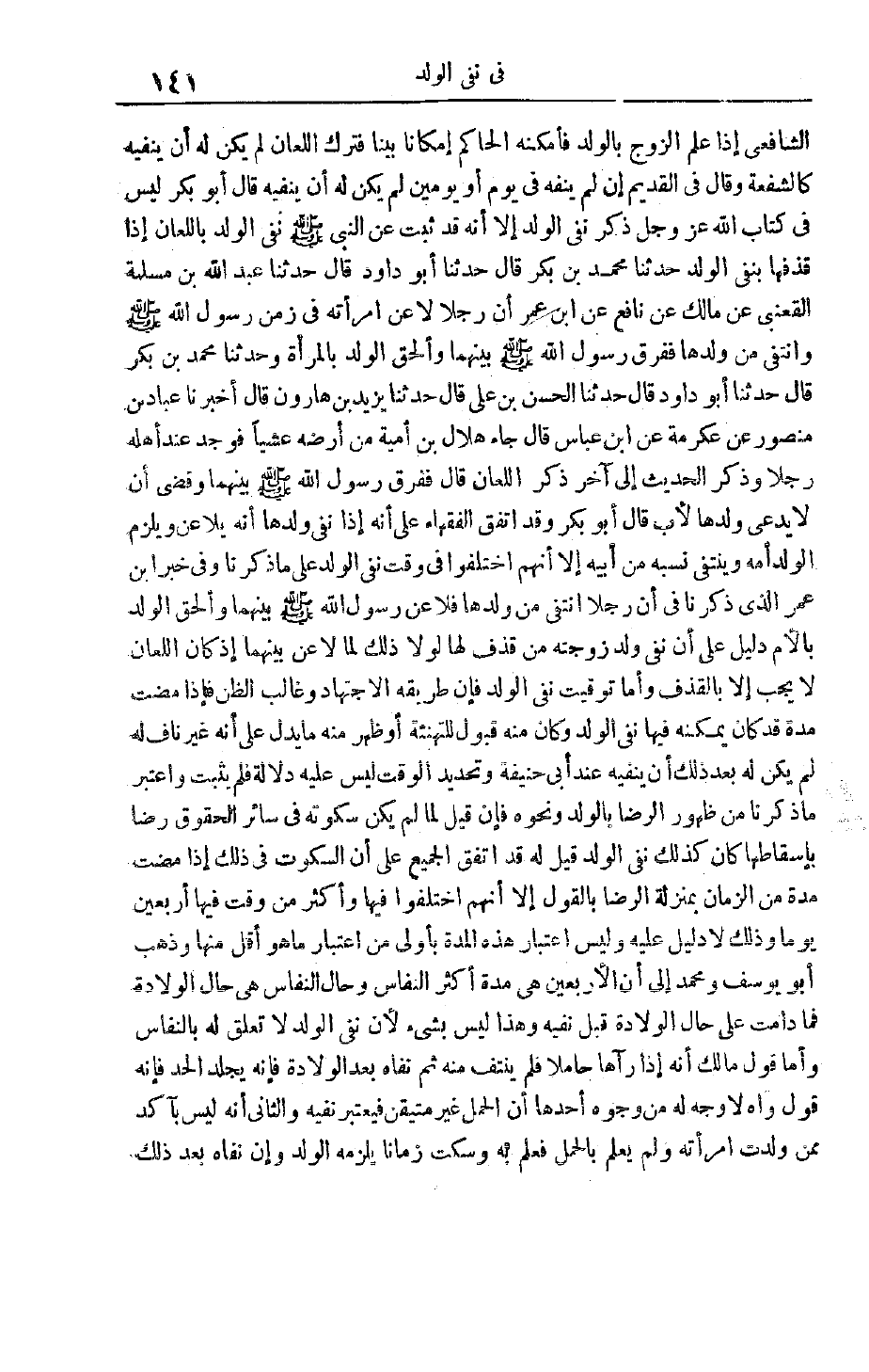 الشَّافِعِيُّ إذَا عَلِمَ الزَّوْجُ بِالْوَلَدِ فَأَمْكَنَهُ الْحَاكِمُ إمْكَانًا بَيِّنًا فَتَرَك اللِّعَانَ لَمْ يَكُنْ لَهُ أَنْ يَنْفِيَهُ كَالشُّفْعَةِ وَقَالَ فِي الْقَدِيمِ إنْ لَمْ يَنْفِهِ فِي يَوْمٍ أَوْ يَوْمَيْنِ لَمْ يَكُنْ لَهُ أَنْ يَنْفِيَهُ قَالَ أَبُو بَكْرٍ لَيْسَ فِي كِتَابِ اللَّهِ عَزَّ وَجَلَّ ذِكْرُ نَفْيِ الْوَلَدِ إلَّا أَنَّهُ قَدْ ثَبَتَ عَنْ النَّبِيِّ صَلَّى اللَّهُ عَلَيْهِ وَسَلَّمَ نَفْيُ الْوَلَدِ بِاللِّعَانِ إذَا قَذَفَهَا بِنَفْيِ الْوَلَدِ