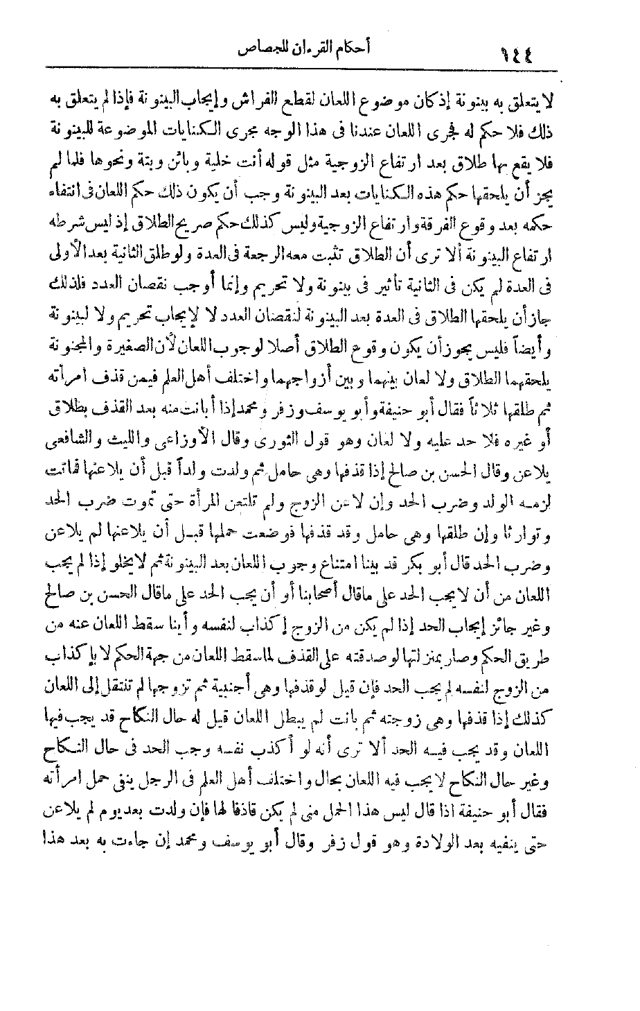 لَا يَتَعَلَّقُ بِهِ بَيْنُونَةٌ إذْ كَانَ مَوْضُوعُ اللِّعَانِ لِقَطْعِ الْفِرَاشِ وَإِيجَابِ الْبَيْنُونَةِ فَإِذَا لَمْ يَتَعَلَّقْ بِهِ ذَلِكَ فَلَا حُكْمَ لَهُ فَجَرَى اللِّعَانُ عِنْدَنَا فِي هَذَا الْوَجْهِ مَجْرَى الْكِنَايَاتِ الْمَوْضُوعَةِ لِلْبَيْنُونَةِ فَلَا يَقَعُ بِهَا طَلَاقٌ بَعْد ارْتِفَاعِ الزَّوْجِيَّةِ مِثْلُ قَوْلِهِ أَنْتِ خَلِيَّةٌ وَبَائِنٌ وَبَتَّةٌ وَنَحْوُهَا فَلَمَّا لَمْ يَجُزْ أَنْ يُلْحِقَهَا حُكْمَ هَذِهِ الْكِنَايَاتِ بَعْدَ الْبَيْنُونَةِ وَجَبَ أَنْ يَكُونَ ذَلِكَ حُكْمُ اللِّعَانِ فِي انْتِفَاءِ حُكْمِهِ بَعْدَ وُقُوعِ الْفُرْقَةِ وَارْتِفَاعِ الزَّوْجِيَّةِ وَلَيْسَ كَذَلِكَ حُكْمُ صَرِيحِ الطَّلَاقِ إذْ لَيْسَ شَرْطُهُ ارْتِفَاعُ الْبَيْنُونَةِ أَلَا تَرَى أَنَّ الطَّلَاقَ تَثْبُتُ مَعَهُ الرَّجْعَةُ فِي الْعِدَّةِ وَلَوْ طَلَّقَ الثَّانِيَةَ بَعْدَ الْأُولَى فِي الْعِدَّةِ لَمْ يَكُنْ فِي الثَّانِيَةِ تَأْثِيرٌ فِي بَيْنُونَةٍ وَلَا تَحْرِيمٍ وَإِنَّمَا أَوْجَبَ نُقْصَانَ الْعَدَدِ فَلِذَلِكَ جَازَ أَنْ يَلْحَقَهَا الطَّلَاقُ فِي الْعِدَّةِ بَعْدَ الْبَيْنُونَةِ لِنُقْصَانِ الْعَدَدِ لَا لِإِيجَابِ تَحْرِيمٍ وَلَا لِبَيْنُونَةٍ وَأَيْضًا فَلَيْسَ يَجُوزُ أَنْ يَكُونَ وُقُوعُ الطَّلَاقِ أَصْلًا لِوُجُوبِ اللِّعَانِ لِأَنَّ الصَّغِيرَةَ وَالْمَجْنُونَةَ يَلْحَقُهُمَا الطَّلَاقُ وَلَا لِعَانَ بَيْنَهُمَا وَبَيْنَ أَزْوَاجِهِمَا وَاخْتَلَفَ أَهْلُ الْعِلْمِ فِيمَنْ قَذَفَ امْرَأَتَهُ ثُمَّ طَلَّقَهَا ثَلَاثًا فَقَالَ أَبُو حَنِيفَةَ وَأَبُو يُوسُفَ وَزُفَرُ وَمُحَمَّدٌ إذا أبانت مِنْهُ بَعْدَ الْقَذْفِ بِطَلَاقٍ أَوْ غَيْرِهِ فَلَا حَدَّ عَلَيْهِ وَلَا لِعَانَ وَهُوَ قَوْلُ الثَّوْرِيِّ وَقَالَ الْأَوْزَاعِيُّ وَاللَّيْثُ وَالشَّافِعِيُّ يُلَاعِنُ وَقَالَ الْحَسَنُ بْنُ صَالِحٍ إذَا قَذَفَهَا وَهِيَ حَامِلٌ ثُمَّ وَلَدَتْ وَلَدًا قَبْلَ أَنْ يُلَاعِنَهَا فَمَاتَتْ لَزِمَهُ الولد وضرب الحد وإن لا عن الزوج ولم تلتعن الْمَرْأَةَ حَتَّى تَمُوتَ ضُرِبَ الْحَدَّ وَتَوَارَثَا وَإِنْ طَلَّقَهَا وَهِيَ حَامِلٌ وَقَدْ قَذَفَهَا فَوَضَعَتْ حَمْلَهَا قَبْلَ أَنْ يُلَاعِنَهَا لَمْ يُلَاعِنْ وَضُرِبَ الْحَدَّ قَالَ أَبُو بَكْرٍ قَدْ بَيَّنَّا امْتِنَاعَ وُجُوبِ اللِّعَانِ بَعْدَ الْبَيْنُونَةِ ثُمَّ لَا يَخْلُو إذَا لَمْ يَجِبْ اللِّعَانُ مِنْ أَنْ لَا يَجِبَ الْحَدُّ عَلَى مَا قَالَ أَصْحَابُنَا أَوْ أَنْ يَجِبَ الْحَدُّ عَلَى مَا قَالَ الْحَسَنُ بْنُ صالح وغير جائز إيجاب الحد إذا لم يكن من الزوج إكذاب لنفسه وأينا سَقَطَ اللِّعَانُ عَنْهُ مِنْ طَرِيقِ الْحُكْمِ وَصَارَ بِمَنْزِلَتِهَا لَوْ صَدَّقَتْهُ عَلَى الْقَذْفِ لَمَا سَقَطَ اللِّعَانُ مِنْ جِهَةِ الْحُكْمِ لَا بِإِكْذَابٍ مِنْ الزَّوْجِ لِنَفْسِهِ لَمْ يَجِبْ الْحَدُّ فَإِنْ قِيلَ لَوْ قَذَفَهَا وَهِيَ أَجْنَبِيَّةٌ ثُمَّ تَزَوَّجَهَا لَمْ تَنْتَقِلْ إلَى اللِّعَانِ كَذَلِكَ إذَا قَذَفَهَا وَهِيَ زَوْجَتُهُ ثُمَّ بَانَتْ لَمْ يَبْطُلْ اللِّعَانُ قِيلَ لَهُ حَالُ النِّكَاحِ قَدْ يَجِبُ فِيهَا اللِّعَانُ وَقَدْ يَجِبُ فِيهِ الْحَدُّ أَلَا تَرَى أَنَّهُ لَوْ أَكْذَبَ نَفْسَهُ وَجَبَ الْحَدُّ فِي حَالِ النِّكَاحِ وَغَيْرُ حَالِ النِّكَاحِ لَا يَجِبُ فِيهِ اللِّعَانُ بِحَالٍ وَاخْتَلَفَ أَهْلُ الْعِلْمِ فِي الرَّجُلِ يَنْفِي حَمْلَ امْرَأَتِهِ فَقَالَ أَبُو حَنِيفَةَ إذَا قَالَ لَيْسَ هَذَا الْحَمْلُ مِنِّي لَمْ يَكُنْ قَاذِفًا لَهَا فَإِنْ وَلَدَتْ بَعْدَ يَوْمٍ لَمْ يُلَاعِنْ حَتَّى يَنْفِيَهُ بَعْدَ الْوِلَادَةِ وَهُوَ قَوْلُ زُفَرَ وَقَالَ أَبُو يُوسُفَ وَمُح