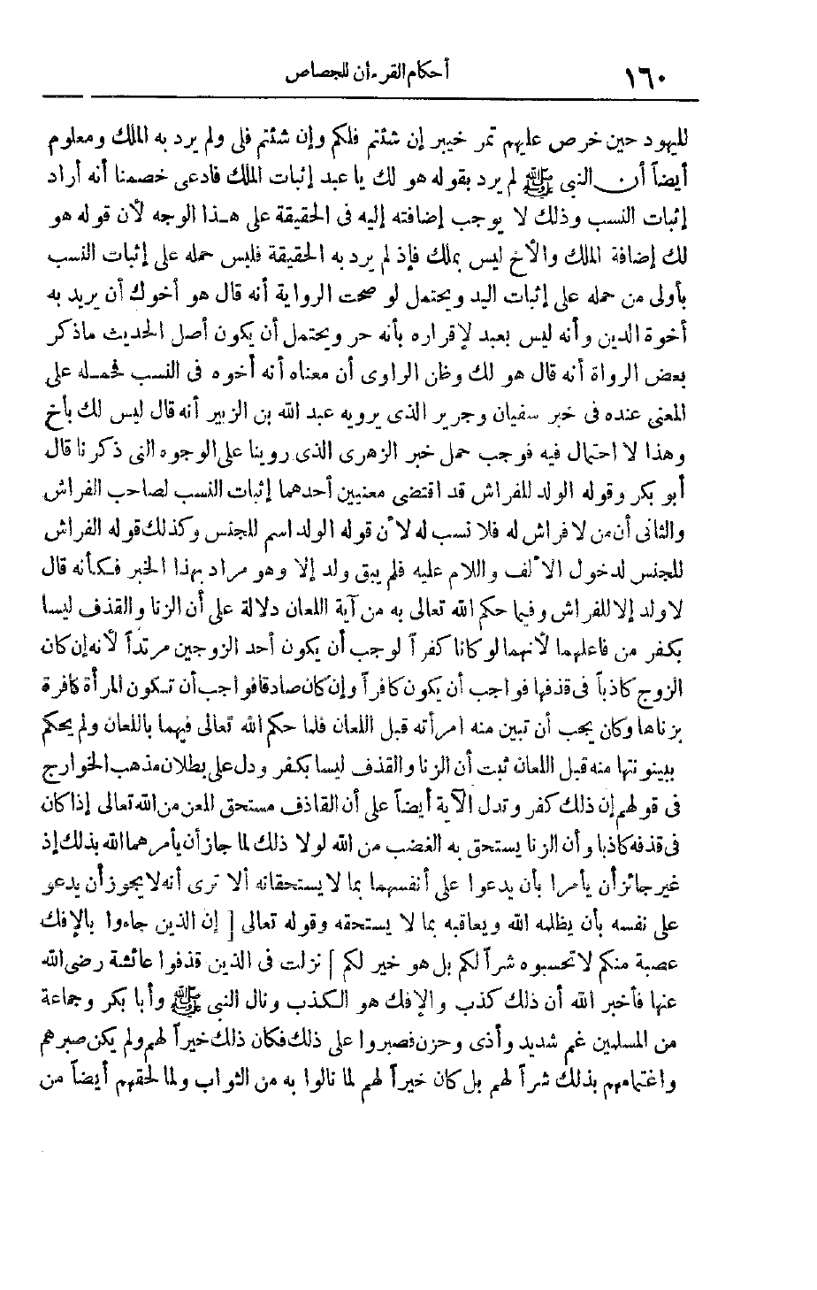 إثْبَاتَ الْمِلْكِ فَادَّعَى خَصْمُنَا أَنَّهُ أَرَادَ إثْبَاتَ النَّسَبِ وَذَلِكَ لَا يُوجِبُ إضَافَتَهُ إلَيْهِ فِي الْحَقِيقَةِ عَلَى هَذَا الْوَجْهِ لِأَنَّ قَوْلَهُ هُوَ لَك إضَافَةُ الْمِلْكِ وَالْأَخُ لَيْسَ بِمِلْكٍ فَإِذْ لَمْ يُرِدْ بِهِ الْحَقِيقَةَ فَلَيْسَ حَمْلُهُ عَلَى إثْبَاتِ النَّسَبِ بِأَوْلَى مِنْ حَمْلِهِ عَلَى إثْبَاتِ الْيَدِ وَيُحْتَمَلُ لَوْ صَحَّتْ الرواية أنه قال هو أخوك أن يُرِيدُ بِهِ أُخُوَّةَ الدِّينِ وَأَنَّهُ لَيْسَ بِعَبْدٍ لِإِقْرَارِهِ بِأَنَّهُ حَرٌّ وَيُحْتَمَلُ أَنْ يَكُونَ أَصْلُ الْحَدِيثِ مَا ذَكَرَ بَعْضُ الرُّوَاةِ أَنَّهُ قَالَ هُوَ لَك وَظَنَّ الرَّاوِيُّ أَنَّ مَعْنَاهُ أَنَّهُ أَخُوهُ فِي النَّسَبِ فَحَمَلَهُ عَلَى الْمَعْنَى عِنْدَهُ فِي خَبَرِ سُفْيَانَ وَجَرِيرٍ الَّذِي يَرْوِيهِ عَبْدُ اللَّهِ بْنُ الزُّبَيْرِ أَنَّهُ قَالَ لَيْسَ لَك بِأَخٍ وَهَذَا لَا احْتِمَالَ فِيهِ فَوَجَبَ حَمْلُ خَبَرِ الزُّهْرِيِّ الَّذِي رَوَيْنَا عَلَى الْوُجُوهِ الَّتِي ذَكَرْنَا قَالَ أَبُو بَكْرٍ وَقَوْلُهُ الْوَلَدُ لِلْفِرَاشِ قَدْ اقْتَضَى مَعْنَيَيْنِ أَحَدُهُمَا إثْبَاتُ النَّسَبِ لِصَاحِبِ الْفِرَاشِ وَالثَّانِي أَنَّ مَنْ لَا فِرَاشَ لَهُ فَلَا نَسَبَ لَهُ لِأَنَّ قَوْلَهُ الْوَلَدُ اسْمٌ لِلْجِنْسِ وَكَذَلِكَ قَوْلُهُ الْفِرَاشُ لِلْجِنْسِ لِدُخُولِ الْأَلِفِ وَاللَّامِ عَلَيْهِ فَلَمْ يَبْقَ وَلَدٌ إلَّا وَهُوَ مُرَادٌ بِهَذَا الْخَبَرِ فَكَأَنَّهُ قَالَ لَا وَلَدَ إلَّا لِلْفِرَاشِ وَفِيمَا حَكَمَ اللَّهُ تَعَالَى بِهِ مِنْ آيَةِ اللِّعَانِ دَلَالَةٌ عَلَى أَنَّ الزِّنَا وَالْقَذْفَ لَيْسَا بِكُفْرٍ مِنْ فَاعِلِهِمَا لِأَنَّهُمَا لَوْ كَانَا كُفْرًا لَوَجَبَ أَنْ يَكُونَ أَحَدُ الزَّوْجَيْنِ مُرْتَدًّا لِأَنَّهُ إنْ كَانَ الزَّوْجُ كَاذِبًا فِي قَذْفِهَا فَوَاجِبٌ أَنْ يَكُونَ كَافِرًا وَإِنْ كَانَ صَادِقًا فَوَاجِبٌ أَنْ تَكُونَ الْمَرْأَةُ كَافِرَةً بِزِنَاهَا وَكَانَ يَجِبُ أَنْ تَبِينَ مِنْهُ امْرَأَتُهُ قَبْلَ اللِّعَانِ فَلَمَّا حَكَمَ اللَّهُ تَعَالَى فِيهِمَا بِاللِّعَانِ وَلَمْ يَحْكُمْ بِبَيْنُونَتِهَا مِنْهُ قَبْلَ اللِّعَانِ ثَبَتَ أَنَّ الزِّنَا وَالْقَذْفَ لَيْسَا بِكُفْرٍ وَدَلَّ عَلَى بُطْلَانِ مَذْهَبِ الْخَوَارِجِ فِي قَوْلِهِمْ إنَّ ذَلِكَ كُفْرٌ وَتَدُلُّ الْآيَةُ أَيْضًا عَلَى أَنَّ الْقَاذِفَ مُسْتَحِقٌّ لِلَّعْنِ مِنْ اللَّهِ تَعَالَى إذَا كَانَ فِي قَذْفِهِ كَاذِبًا وَأَنَّ الزِّنَا يَسْتَحِقُّ بِهِ الْغَضَبَ مِنْ اللَّهِ لَوْلَا ذَلِكَ لَمَا جَازَ أن يأمر هما الله بذلك إذ غير جائز أن يأمرا بِأَنْ يَدْعُوَا عَلَى أَنْفُسِهِمَا بِمَا لَا يَسْتَحِقَّانِهِ أَلَا تَرَى أَنَّهُ لَا يَجُوزُ أَنْ يَدْعُوَ عَلَى نَفْسِهِ بِأَنْ يَظْلِمَهُ اللَّهُ وَيُعَاقِبَهُ بِمَا لا يستحقه وقوله تعالى إِنَّ الَّذِينَ جاؤُ بِالْإِفْكِ عُصْبَةٌ مِنْكُمْ لا تَحْسَبُوهُ شَرًّا لَكُمْ بَلْ هُوَ خَيْرٌ لَكُمْ نَزَلَتْ فِي الَّذِينَ قَذَفُوا عَائِشَةَ رَضِيَ اللَّهُ عَنْهَا فَأَخْبَرَ اللَّهُ أَنَّ ذَلِكَ كَذِبٌ وَالْإِفْكُ هُوَ الْكَذِبُ وَنَالَ النَّبِيَّ صَلَّى اللَّهُ عَلَيْهِ وَسَلَّمَ وَأَبَا بَكْرٍ وَجَمَاعَةً مِنْ الْمُسْلِمِينَ غَمٌّ شَدِيدٌ وَأَذًى وَحُزْنٌ فَصَبَرُوا عَلَى ذَلِكَ فَكَانَ ذَلِكَ خَيْرًا لَهُمْ وَلَمْ يَكُنْ صَبْرُهُمْ وَاغْتِمَامُهُمْ بِذَلِكَ شَرًّا لَهُمْ بَلْ كَانَ خَيْرًا لَهُمْ لِمَا نَالُوا بِهِ مِنْ الثَّوَابِ وَلِمَا لَحِقَهُمْ أيضا من