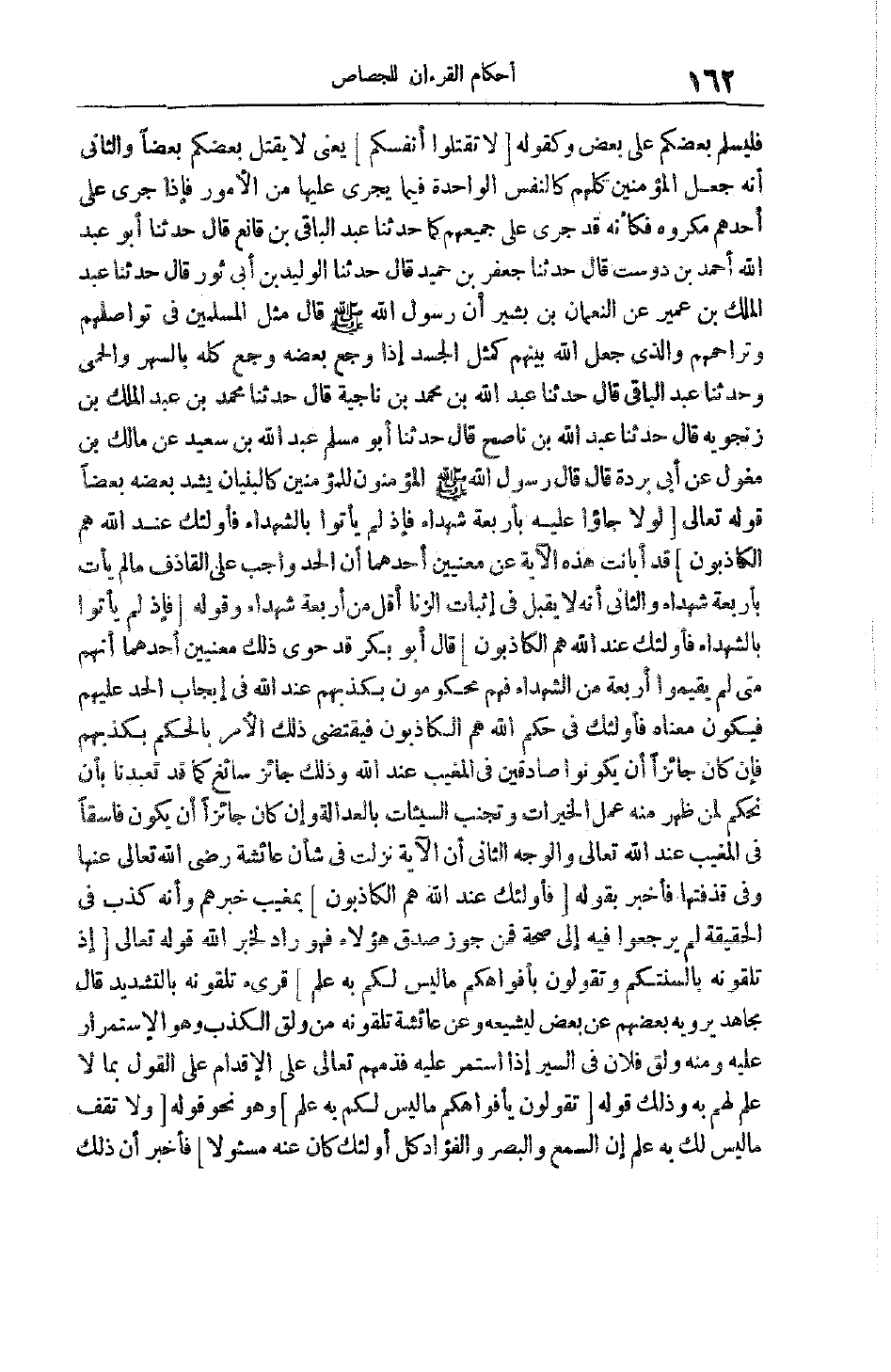 قوله تعالى لَوْلا جاؤُ عَلَيْهِ بِأَرْبَعَةِ شُهَداءَ فَإِذْ لَمْ يَأْتُوا بِالشُّهَداءِ فَأُولئِكَ عِنْدَ اللَّهِ هُمُ الْكاذِبُونَ قَدْ أَبَانَتْ هَذِهِ الْآيَةُ عَنْ مَعْنَيَيْنِ أَحَدُهُمَا أَنَّ الْحَدَّ وَاجِبٌ عَلَى الْقَاذِفِ مَا لَمْ يَأْتِ بِأَرْبَعَةِ شُهَدَاءَ وَالثَّانِي أَنَّهُ لَا يُقْبَلُ فِي إثْبَاتِ الزِّنَا أَقَلُّ مِنْ أَرْبَعَةِ شُهَدَاءَ وقوله فَإِذْ لَمْ يَأْتُوا بِالشُّهَداءِ فَأُولئِكَ عِنْدَ اللَّهِ هُمُ الْكاذِبُونَ قَالَ أَبُو بَكْرٍ قَدْ حَوَى ذَلِكَ مَعْنَيَيْنِ أَحَدُهُمَا أَنَّهُمْ مَتَى لَمْ يُقِيمُوا أَرْبَعَةً مِنْ الشُّهَدَاءِ فَهُمْ مَحْكُومُونَ بِكَذِبِهِمْ عِنْدَ اللَّهِ فِي إيجَابِ الْحَدِّ عَلَيْهِمْ فَيَكُونُ مَعْنَاهُ فَأُولَئِكَ فِي حُكْمِ اللَّهِ هُمْ الْكَاذِبُونَ فَيَقْتَضِي ذَلِكَ الْأَمْرُ بِالْحُكْمِ بِكَذِبِهِمْ فَإِنْ كَانَ جَائِزًا أَنْ يَكُونُوا صَادِقِينَ فِي الْمُغَيَّبِ عِنْدَ اللَّهِ وَذَلِكَ جَائِزٌ سَائِغٌ كَمَا قَدْ تَعَبَّدَنَا بِأَنْ نَحْكُمَ لِمَنْ ظَهَرَ مِنْهُ عَمَلُ الْخَيْرَاتِ وَتَجَنُّبُ السَّيِّئَاتِ بِالْعَدَالَةِ وَإِنْ كَانَ جَائِزًا أَنْ يَكُونَ فَاسِقًا فِي الْمُغَيَّبِ عِنْدَ اللَّهِ تَعَالَى وَالْوَجْهُ الثَّانِي أَنَّ الْآيَةَ نَزَلَتْ فِي شَأْنِ عَائِشَةَ رَضِيَ اللَّهُ تَعَالَى عَنْهَا وَفِي قَذَفَتِهَا فَأَخْبَرَ بِقَوْلِهِ فَأُولئِكَ عِنْدَ اللَّهِ هُمُ الْكاذِبُونَ بِمُغَيَّبِ خَبَرِهِمْ وَأَنَّهُ كَذِبٌ فِي الْحَقِيقَةِ لَمْ يَرْجِعُوا فِيهِ إلَى صِحَّةٍ فَمَنْ جَوَّزَ صِدْقَ هَؤُلَاءِ فَهُوَ رَادٌّ لِخَبَرِ اللَّهِ