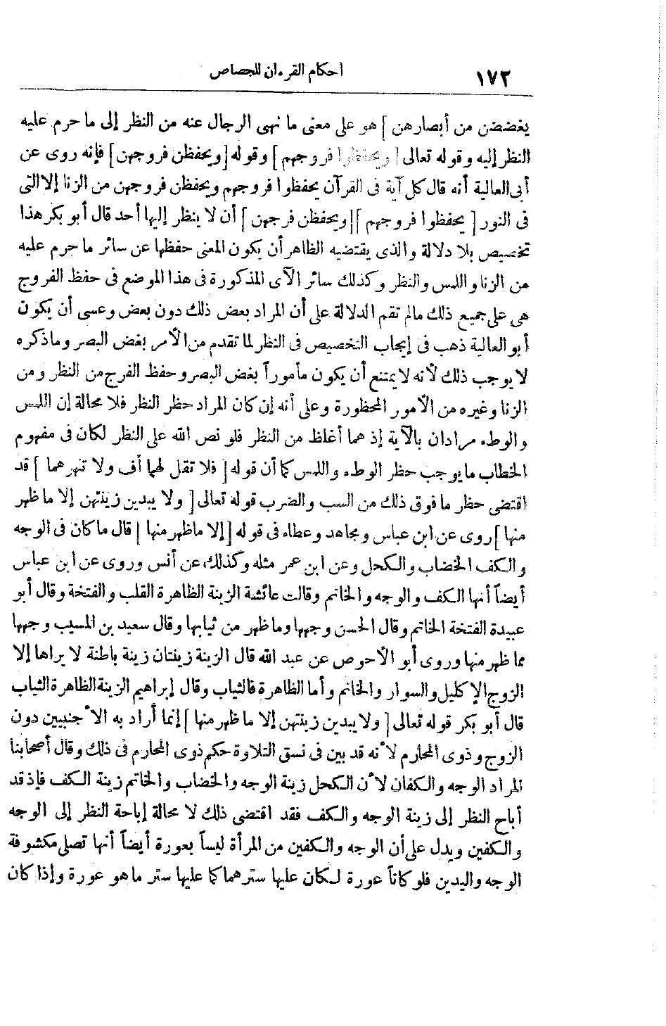 هو على معنى ما نهى الرجال عَنْهُ مِنْ النَّظَرِ إلَى مَا حَرُمَ عَلَيْهِ النظر إليه وقوله تعالى وَيَحْفَظُوا فُرُوجَهُمْ وقوله وَيَحْفَظْنَ فُرُوجَهُنَّ فَإِنَّهُ رُوِيَ عَنْ أَبِي الْعَالِيَةِ أَنَّهُ قَالَ كُلُّ آيَةٍ فِي الْقُرْآنِ يَحْفَظُوا فُرُوجَهُمْ وَيَحْفَظْنَ فُرُوجَهُنَّ مِنْ الزِّنَا إلَّا الَّتِي فِي النُّورِ يَحْفَظُوا فُرُوجَهُمْ وَيَحْفَظْنَ فُرُوجَهُنَّ أَنْ لَا يَنْظُرَ إلَيْهَا أَحَدٌ قَالَ أَبُو بَكْرٍ هَذَا تَخْصِيصٌ بِلَا دَلَالَةٍ وَاَلَّذِي يَقْتَضِيهِ الظَّاهِرُ أَنْ يَكُونَ الْمَعْنَى حِفْظَهَا عَنْ سَائِرِ مَا حَرُمَ عَلَيْهِ مِنْ الزِّنَا وَاللَّمْسِ وَالنَّظَرِ وكذلك سائر الآي المذكورة في هَذَا الْمَوْضِعِ فِي حِفْظِ الْفُرُوجِ هِيَ عَلَى جَمِيعِ ذَلِكَ مَا لَمْ تَقُمْ الدَّلَالَةُ عَلَى أَنَّ الْمُرَادَ بَعْضُ ذَلِكَ دُونَ بَعْضٍ وَعَسَى أَنْ يَكُونَ أَبُو الْعَالِيَةِ ذَهَبَ فِي إيجَابِ التَّخْصِيصِ فِي النَّظَرِ لِمَا تَقَدَّمَ مِنْ الْأَمْرِ بِغَضِّ الْبَصَرِ وَمَا ذَكَرَهُ لَا يُوجِبُ ذَلِكَ لِأَنَّهُ لَا يَمْتَنِعُ أَنْ يَكُونَ مَأْمُورًا بِغَضِّ الْبَصَرِ وَحِفْظِ الْفَرْجِ مِنْ النَّظَرِ وَمِنْ الزِّنَا وَغَيْرِهِ مِنْ الْأُمُورِ الْمَحْظُورَةِ وَعَلَى أَنَّهُ إنْ كَانَ الْمُرَادُ حَظْرَ النَّظَرِ فَلَا مَحَالَةَ أَنَّ اللَّمْسَ وَالْوَطْءَ مُرَادَانِ بِالْآيَةِ إذْ هُمَا أَغْلَظُ مِنْ النَّظَرِ فَلَوْ نَصَّ اللَّهُ عَلَى النَّظَرِ لَكَانَ فِي مَفْهُومِ الْخِطَابِ مَا يُوجِبُ حَظْرَ الْوَطْءِ وَاللَّمْسِ كَمَا أَنَّ قَوْلَهُ فَلا تَقُلْ لَهُما أُفٍّ وَلا تَنْهَرْهُما قَدْ اقْتَضَى حَظْرَ مَا فَوْقَ ذَلِكَ مِنْ السَّبِّ وَالضَّرْبِ قَوْله تَعَالَى وَلا يُبْدِينَ زِينَتَهُنَّ إِلَّا ما ظَهَرَ مِنْها رُوِيَ عَنْ ابْنِ عَبَّاسٍ وَمُجَاهِدٍ وَعَطَاءٍ فِي قوله إِلَّا ما ظَهَرَ مِنْها قَالَ مَا كَانَ فِي الْوَجْهِ وَالْكَفِّ الْخِضَابُ وَالْكُحْلُ وَعَنْ ابْنِ عُمَرَ مِثْلُهُ وَكَذَلِكَ عَنْ أَنَسٍ وَرُوِيَ عَنْ ابْنِ عَبَّاسٍ أَيْضًا أَنَّهَا الْكَفُّ وَالْوَجْهُ وَالْخَاتَمُ وَقَالَتْ عَائِشَةُ الزِّينَةُ الظَّاهِرَةُ الْقُلْبُ وَالْفَتْخَةُ وَقَالَ أَبُو عُبَيْدَةَ الْفَتْخَةُ الْخَاتَمُ وَقَالَ الْحَسَنُ وَجْهُهَا وَمَا ظَهَرَ مِنْ ثِيَابِهَا وَقَالَ سَعِيدُ بْنُ الْمُسَيِّبِ وَجْهُهَا مِمَّا ظَهَرَ مِنْهَا وَرَوَى أَبُو الْأَحْوَصِ عَنْ عَبْدِ اللَّهِ قَالَ الزِّينَةُ زِينَتَانِ زِينَةٌ بَاطِنَةٌ لَا يَرَاهَا إلَّا الزَّوْجُ الْإِكْلِيلُ وَالسِّوَارُ وَالْخَاتَمُ وَأَمَّا الظَّاهِرَةُ فَالثِّيَابُ وَقَالَ إبْرَاهِيمُ الزِّينَةُ الظَّاهِرَةُ الثِّيَابُ قَالَ أَبُو بَكْرٍ قَوْله تَعَالَى وَلا يُبْدِينَ زِينَتَهُنَّ إِلَّا ما ظَهَرَ مِنْها إنَّمَا أَرَادَ بِهِ الْأَجْنَبِيِّينَ دُونَ الزَّوْجِ وَذَوِي الْمَحَارِمِ لِأَنَّهُ قَدْ بَيَّنَ فِي نَسَقِ التِّلَاوَةِ حُكْمَ ذَوِي الْمَحَارِمِ فِي ذَلِكَ وَقَالَ أَصْحَابُنَا الْمُرَادُ الْوَجْهُ وَالْكَفَّانِ لِأَنَّ الْكُحْلَ زِينَةُ الْوَجْهِ وَالْخِضَابَ وَالْخَاتَمَ زِينَةُ الْكَفِّ فَإِذْ قَدْ أَبَاحَ النَّظَرَ إلَى زِينَةِ الْوَجْهِ وَالْكَفِّ فَقَدْ اقْتَضَى ذَلِكَ لَا مَحَالَةَ إبَاحَةَ النَّظَرِ إلَى الْوَجْهِ وَالْكَفَّيْنِ وَيَدُلُّ عَلَى أَنَّ الْوَجْهَ وَالْكَفَّيْنِ مِنْ الْمَرْأَةِ لَيْسَا بِعَوْرَةٍ أَيْضًا أَنَّهَا تُصَلِّي مَكْشُوفَةَ الْوَجْهِ وَالْيَدَيْنِ فَلَوْ كَانَا عَوْرَةً لَكَانَ عَلَيْهَا سَتْرُهُمَا كَمَا عَلَيْهَا سَتْرُ مَا هُوَ عَوْرَةٌ وإذا كان