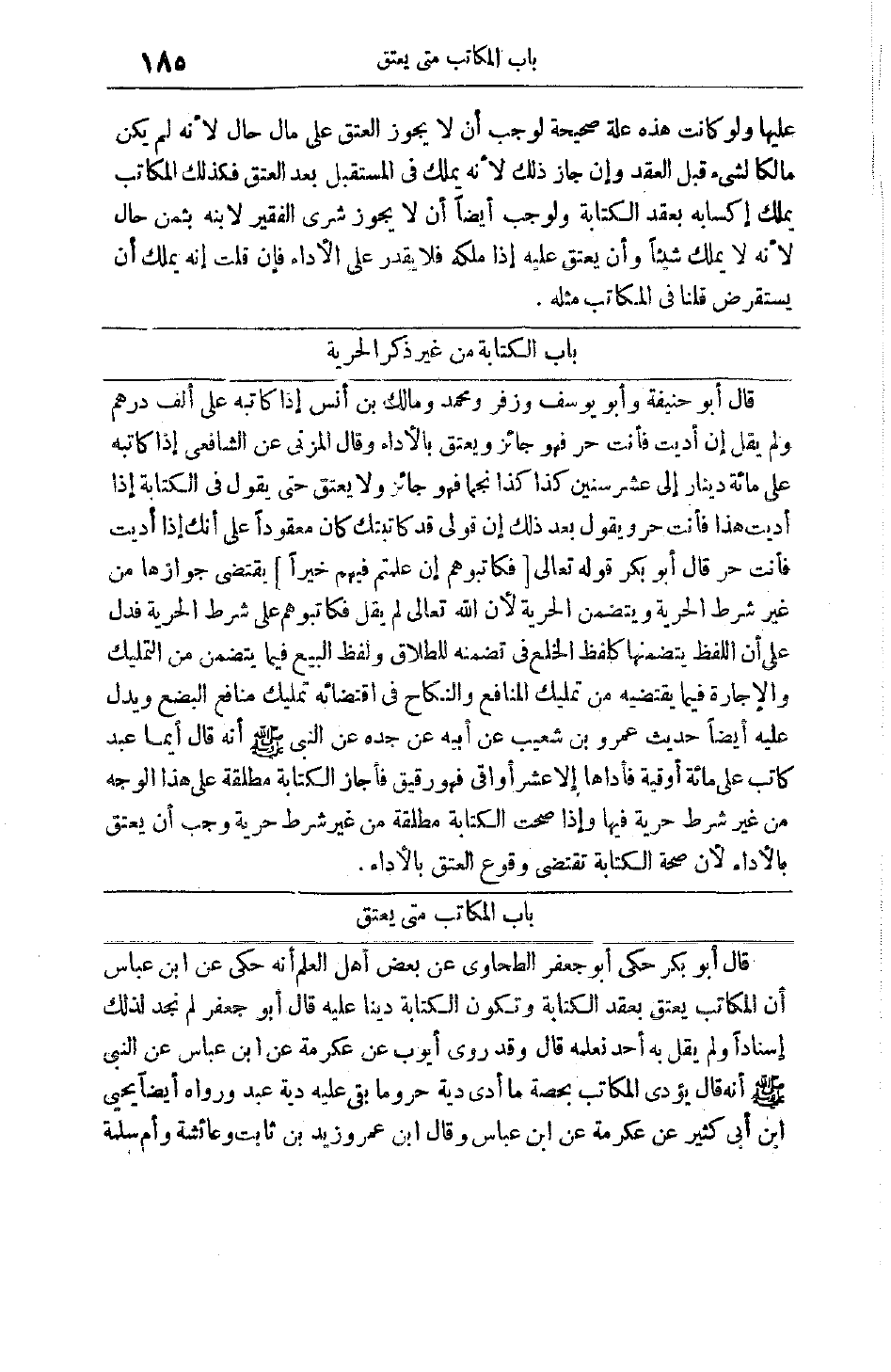 قَالَ أَبُو بَكْرٍ حَكَى أَبُو جَعْفَرٍ الطَّحَاوِيُّ عَنْ بَعْضِ أَهْلِ الْعِلْمِ أَنَّهُ حُكِيَ عَنْ ابْنِ عَبَّاسٍ أَنَّ الْمُكَاتَبَ يُعْتَقُ بِعَقْدِ الْكِتَابَةِ وَتَكُونُ الْكِتَابَةُ دَيْنًا عَلَيْهِ قَالَ أَبُو جَعْفَرٍ لَمْ نَجِدْ لِذَلِكَ إسْنَادًا وَلَمْ يَقُلْ بِهِ أَحَدٌ نَعْلَمُهُ قَالَ