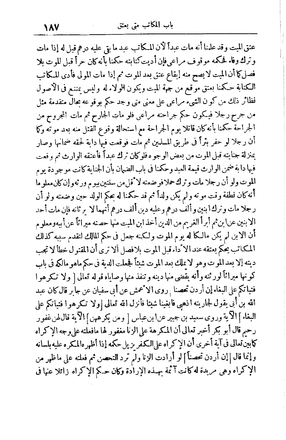 عِتْقُ الْمَيِّتِ وَقَدْ عَلِمْنَا أَنَّهُ مَاتَ عَبْدًا لِأَنَّ الْمُكَاتَبَ عَبْدٌ مَا بَقِيَ عَلَيْهِ دِرْهَمٌ قِيلَ لَهُ إذَا مَاتَ وَتَرَكَ وَفَاءً فَحُكْمُهُ مَوْقُوفٌ مُرَاعًى فَإِنْ أُدِّيَتْ كِتَابَتُهُ حَكَمْنَا بِأَنَّهُ كَانَ حُرًّا قَبْلَ الْمَوْتِ بِلَا فَصْلٍ كَمَا أَنَّ الْمَيِّتَ لَا يَصِحُّ مِنْهُ إيقَاعُ عِتْقٍ بَعْدَ الْمَوْتِ ثُمَّ إذَا مَاتَ الْمَوْلَى فَأَدَّى الْمُكَاتَبُ الْكِتَابَةَ حَكَمْنَا بِعِتْقٍ مُوقَعٍ مِنْ جِهَةِ الْمَيِّتِ وَيَكُونُ الْوَلَاءُ لَهُ وَلَيْسَ يَمْتَنِعُ فِي الْأُصُولِ نَظَائِرُ ذَلِكَ مِنْ كَوْنِ الشَّيْءِ مُرَاعًى عَلَى مَعْنَى مَتَى وُجِدَ حُكِمَ بِوُقُوعِهِ بِحَالٍ مُتَقَدِّمَةٍ مِثْلُ مَنْ جَرَحَ رَجُلًا فَيَكُونُ حُكْمُ جِرَاحَتِهِ مُرَاعًى فَلَوْ مَاتَ الْجَارِحُ ثُمَّ مَاتَ الْمَجْرُوحُ مِنْ الْجِرَاحَةِ حَكَمْنَا بِأَنَّهُ كَانَ قَاتِلًا يَوْمَ الْجِرَاحَةِ مَعَ اسْتِحَالَةِ وُقُوعِ الْقَتْلِ مِنْهُ بعد موته وكما أن رَجُلًا لَوْ حَفَرَ بِئْرًا فِي طَرِيقِ الْمُسْلِمِينَ ثم مات فوقعت فيها دابة لَحِقَهُ ضَمَانُهَا وَصَارَ بِمَنْزِلَةِ جِنَايَتِهِ قَبْلَ الْمَوْتِ مِنْ بَعْضِ الْوُجُوهِ فَلَوْ كَانَ تَرَكَ عَبْدًا فَأَعْتَقَهُ الْوَارِثُ ثُمَّ وَقَعَتْ فِيهَا دَابَّةٌ ضَمِنَ الْوَارِثُ قِيمَةَ الْعَبْدِ وَحَكَمْنَا فِي بَابِ الضَّمَانِ بِأَنَّ الْجِنَايَةَ كَانَتْ مَوْجُودَةً يَوْمَ الْمَوْتِ وَلَوْ أَنَّ رَجُلًا مَاتَ وَتَرَكَ حَمْلًا فَوَضَعَتْهُ لِأَقَلَّ مِنْ سَنَتَيْنِ بِيَوْمٍ وَرِثَهُ وَإِنْ كَانَ مَعْلُومًا أَنَّهُ كَانَ نُطْفَةً وَقْتَ مَوْتِهِ وَلَمْ يَكُنْ وَلَدًا ثُمَّ قَدْ حَكَمْنَا لَهُ بِحُكْمِ الْوَلَدِ حِينَ وَضَعَتْهُ وَلَوْ أَنَّ رَجُلًا مَاتَ وَتَرَكَ ابْنَيْنِ وَأَلْفَ دِرْهَمٍ وَعَلَيْهِ دَيْنٌ أَلْفُ دِرْهَمٍ أَنَّهُمَا لَا يَرِثَانِهِ فَإِنْ مَاتَ أَحَدُ الِابْنَيْنِ عَنْ ابْنٍ ثُمَّ أَبْرَأَ الْغَرِيمَ مِنْ الدَّيْنِ أَخَذَ ابْنُ الْمَيِّتِ مِنْهَا حِصَّتَهُ مِيرَاثًا عَنْ أَبِيهِ وَمَعْلُومٌ أَنَّ الِابْنَ لَمْ يَكُنْ مَالِكًا لَهُ يَوْمَ الْمَوْتِ وَلَكِنَّهُ جُعِلَ فِي حُكْمِ الْمَالِكِ لِتَقَدُّمِ سَبَبِهِ كَذَلِكَ الْمُكَاتَبُ يُحْكَمُ بِعِتْقِهِ عِنْدَ الْأَدَاءِ قَبْلَ الْمَوْتِ بِلَا فَصْلٍ أَلَا تَرَى أَنَّ الْمَقْتُولَ خَطَأً لَا تَجِبُ دِيَتُهُ إلَّا بَعْدَ الْمَوْتِ وَهُوَ لَا يَمْلِكُ بَعْدَ الْمَوْتِ شَيْئًا فَجُعِلَتْ الدِّيَةُ فِي حُكْمِ مَا هُوَ مَالِكُهُ فِي بَابِ كَوْنِهَا مِيرَاثًا لِوَرَثَتِهِ وأنه يقضى منها دينه وَتُنَفَّذُ مِنْهَا وَصَايَاهُ قَوْله تَعَالَى وَلا تُكْرِهُوا فَتَياتِكُمْ عَلَى الْبِغاءِ إِنْ أَرَدْنَ تَحَصُّناً رَوَى الْأَعْمَشُ عَنْ أَبِي سُفْيَانَ عَنْ جَابِرٍ قَالَ كَانَ عَبْدُ اللَّهِ بْنُ أُبَيٍّ يَقُولُ لِجَارِيَتِهِ اذْهَبِي فَابْغِينَا شَيْئًا فَأَنْزَلَ اللَّهُ تَعَالَى وَلا تُكْرِهُوا فَتَياتِكُمْ عَلَى الْبِغاءِ الْآيَةَ وَرَوَى سَعِيدُ بْنُ جُبَيْرٍ عَنْ ابْنِ عَبَّاسٍ وَمَنْ يُكْرِهْهُنَّ الْآيَةَ قَالَ لَهُنَّ غَفُورٌ رَحِيمٌ قَالَ أَبُو بَكْرٍ أَخْبَرَ تَعَالَى أَنَّ الْمُكْرَهَةَ عَلَى الزِّنَا مَغْفُورٌ لَهَا مَا فَعَلَتْهُ عَلَى وَجْهِ الْإِكْرَاهِ كَمَا بَيَّنَ تَعَالَى فِي آيَةٍ أُخْرَى أَنَّ الْإِكْرَاهَ عَلَى الْكُفْرِ يُزِيلُ حُكْمَهُ إذَا أَظْهَرَهُ الْمُكْرَهُ عَلَيْهِ بِلِسَانِهِ وَإِنَّمَا قَالَ إِنْ أَرَدْنَ تَحَصُّناً لَوْ أَرَادَتْ الزِّنَا وَلَمْ تُرِدْ التَّحَصُّنَ ثُمَّ فَعَلَتْهُ عَلَى مَا ظَهَرَ مِنْ الْإِكْرَاهِ وَهِيَ مُرِيدَةٌ لَهُ كَانَتْ آثِمَةً بِهَذِهِ الْإِرَادَةِ وَكَانَ حُكْمُ ا