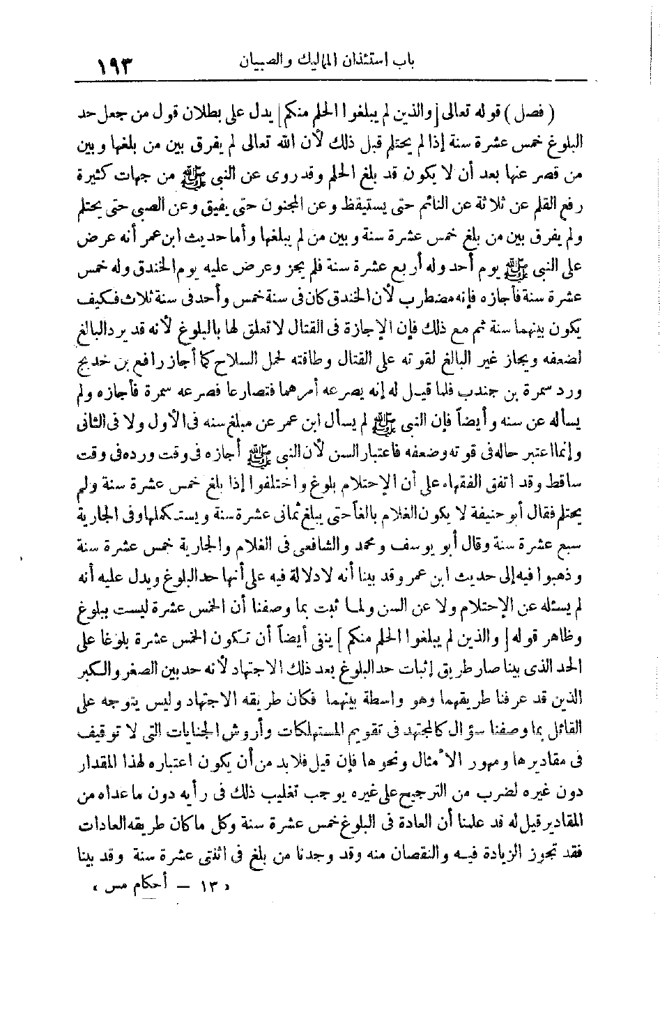 (فَصْلُ) قَوْله تَعَالَى وَالَّذِينَ لَمْ يَبْلُغُوا الْحُلُمَ مِنْكُمْ يَدُلُّ عَلَى بُطْلَانِ قَوْلِ مَنْ جَعَلَ حَدَّ البلوغ خمس عشرة سنة إذا لَمْ يَحْتَلِمْ قَبْلَ ذَلِكَ لِأَنَّ اللَّهَ تَعَالَى لَمْ يُفَرِّقْ بَيْنَ مَنْ بَلَغَهَا وَبَيْنَ مَنْ قَصُرَ عَنْهَا بَعْدَ أَنْ لَا يَكُونَ قَدْ بَلَغَ الْحُلُمَ