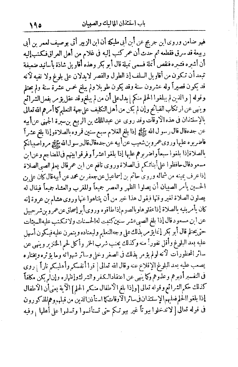 وَرَوَى ابْنُ جُرَيْجٍ عَنْ ابْنِ أَبِي مُلَيْكَةَ أَنَّ ابْنَ الزُّبَيْرِ أَتَى بِوَصِيفٍ لِعُمَرَ بْنِ أَبِي رَبِيعَةَ قَدْ سَرَقَ فَقَطَعَهُ ثُمَّ حَدَثَ أَنَّ عُمَرَ كَتَبَ إلَيْهِ فِي غُلَامٍ مِنْ أَهْلِ الْعِرَاقِ فَكَتَبَ إلَيْهِ أَنْ اشْبِرْهُ فَشَبَرَهُ فَنَقَصَ أُنْمُلَةً فَسُمِّيَ نُمَيْلَةُ قَالَ أَبُو بَكْرٍ وَهَذِهِ أَقَاوِيلُ شَاذَّةٌ بِأَسَانِيدَ ضَعِيفَةٍ تَبْعُدُ أَنْ تَكُونَ مِنْ أَقَاوِيلِ السَّلَفِ إذْ الطُّولُ وَالْقِصَرُ لَا يَدُلَّانِ عَلَى بُلُوغٍ وَلَا نَفْيِهِ لِأَنَّهُ قَدْ يَكُونُ قَصِيرًا وَلَهُ عِشْرُونَ سنة وقد يكون طويلا ولم يَبْلُغُ خَمْسَ عَشْرَةَ سَنَةً وَلَمْ يَحْتَلِمْ وَقَوْلُهُ وَالَّذِينَ لَمْ يَبْلُغُوا الْحُلُمَ مِنْكُمْ يَدُلُّ عَلَى أَنَّ مَنْ لَمْ يَبْلُغْ وَقَدْ عَقَلَ يُؤْمَرُ بِفِعْلِ الشَّرَائِعِ وَيُنْهَى عَنْ ارْتِكَابِ الْقَبَائِحِ وَإِنْ لَمْ يَكُنْ مِنْ أَهْلِ التَّكْلِيفِ عَلَى جِهَةِ التَّعْلِيمِ كَمَا أَمَرَهُمْ اللَّهُ تَعَالَى بِالِاسْتِئْذَانِ فِي هَذِهِ الْأَوْقَاتِ