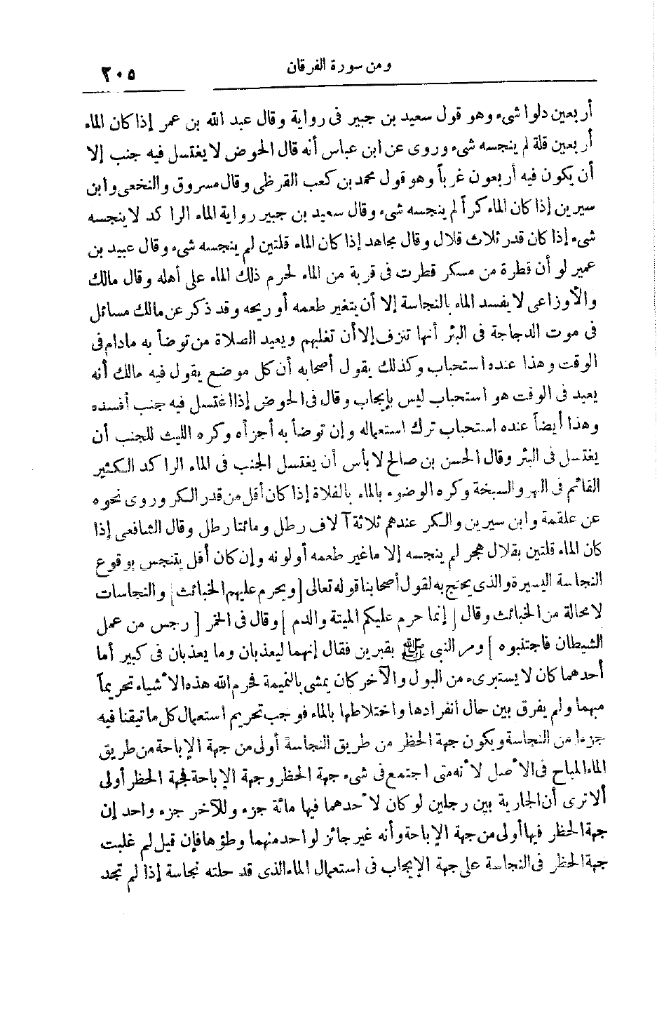 أَرْبَعِينَ دَلْوًا شَيْءٌ وَهُوَ قَوْلُ سَعِيدِ بْنِ جُبَيْرٍ فِي رِوَايَةٍ وَقَالَ عَبْدُ اللَّهِ بْنُ عُمَرَ إذَا كَانَ الْمَاءُ أَرْبَعِينَ قُلَّةً لَمْ يُنَجِّسْهُ شَيْءٌ وَرُوِيَ عَنْ ابْنِ عَبَّاسٍ أَنَّهُ قَالَ الْحَوْضُ لَا يَغْتَسِلُ فِيهِ جُنُبٌ إلَّا أَنْ يَكُونَ فِيهِ أَرْبَعُونَ غَرْبًا وَهُوَ قَوْلُ مُحَمَّدِ بْنِ كَعْبٍ الْقُرَظِيّ وَقَالَ مَسْرُوقٌ وَالنَّخَعِيُّ وَابْنُ سِيرِينَ إذَا كَانَ الْمَاءُ كَرًّا لَمْ ينجسه شيء وقال سعيد بن جبير رواية الْمَاءُ الرَّاكِدُ لَا يُنَجِّسُهُ شَيْءٌ إذَا كَانَ قَدْرَ ثَلَاثِ قِلَالٍ وَقَالَ مُجَاهِدٌ إذَا كَانَ الْمَاءُ قُلَّتَيْنِ لَمْ يُنَجِّسْهُ شَيْءٌ وَقَالَ عُبَيْدُ بْنُ عُمَيْرٍ لَوْ أَنَّ قَطْرَةً مِنْ مُسْكِرٍ قُطِرَتْ فِي قِرْبَةٍ مِنْ الْمَاءِ لَحُرِّمَ ذَلِكَ الْمَاءُ عَلَى أَهْلِهِ وَقَالَ مَالِكٌ وَالْأَوْزَاعِيِّ لَا يَفْسُدُ الْمَاءُ بِالنَّجَاسَةِ إلَّا أَنْ يَتَغَيَّرَ طَعْمُهُ أَوْ رِيحُهُ وَقَدْ ذُكِرَ عَنْ مَالِكٍ مَسَائِلُ فِي مَوْتِ الدَّجَاجَةِ فِي الْبِئْرِ أَنَّهَا تُنْزَفُ إلَّا أَنْ تَغْلِبَهُمْ وَيُعِيدُ الصَّلَاةَ مَنْ تَوَضَّأَ به مادام فِي الْوَقْتِ وَهَذَا عِنْدَهُ اسْتِحْبَابٌ وَكَذَلِكَ يَقُولُ أَصْحَابُهُ إنَّ كُلَّ مَوْضِعٍ يَقُولُ فِيهِ مَالِكٌ إنَّهُ يُعِيدُ فِي الْوَقْتِ هُوَ اسْتِحْبَابٌ لَيْسَ بِإِيجَابٍ وَقَالَ فِي الْحَوْضِ إذَا اغْتَسَلَ فِيهِ جنب أفسده وهذا أيضا عنده استحباب ترك اسْتِعْمَالِهِ وَإِنْ تَوَضَّأَ بِهِ أَجْزَأَهُ وَكَرِهَ اللَّيْثُ لِلْجُنُبِ أَنْ يَغْتَسِلَ فِي الْبِئْرِ وَقَالَ الْحَسَنُ بْنُ صَالِحٍ لَا بَأْسَ أَنْ يَغْتَسِلَ الْجُنُبُ في الماء الراكد الكثير القائم في الهر وَالسَّبْخَةِ وَكَرِهَ الْوُضُوءَ بِالْمَاءِ بِالْفَلَاةِ إذَا كَانَ أَقَلَّ مِنْ قَدْرِ الْكُرِّ وَرُوِيَ نَحْوُهُ عَنْ عَلْقَمَةَ وَابْنِ سِيرِينَ وَالْكُرُّ عِنْدَهُمْ ثَلَاثَةُ آلَافِ رِطْلٍ وَمِائَتَا رِطْلٍ وَقَالَ الشَّافِعِيُّ إذَا كَانَ الْمَاءُ قُلَّتَيْنِ بِقِلَالِ هَجَرَ لَمْ يُنَجِّسْهُ إلَّا مَا غَيَّرَ طَعْمَهُ أَوْ لَوْنَهُ وَإِنْ كَانَ أَقَلَّ يَتَنَجَّسُ بِوُقُوعِ النَّجَاسَةِ الْيَسِيرَةِ وَاَلَّذِي يُحْتَجُّ بِهِ لِقَوْلِ أَصْحَابِنَا قَوْله تَعَالَى وَيُحَرِّمُ عَلَيْهِمُ الْخَبائِثَ وَالنَّجَاسَاتُ لَا مَحَالَةَ مِنْ الْخَبَائِثِ وَقَالَ إِنَّما حَرَّمَ عَلَيْكُمُ الْمَيْتَةَ وَالدَّمَ وَقَالَ فِي الْخَمْرِ رِجْسٌ مِنْ عَمَلِ الشَّيْطانِ فَاجْتَنِبُوهُ
